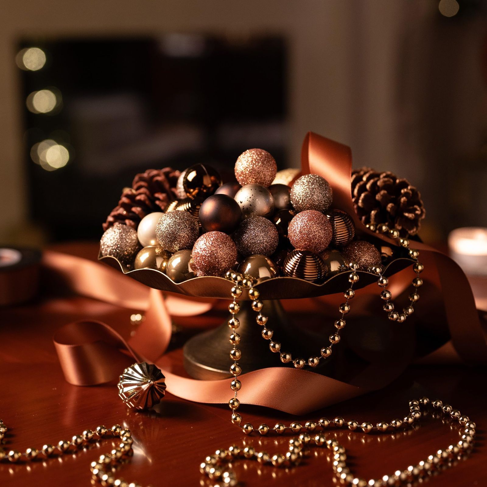 【色合わせ】クリスマスボールオーナメントは3つの独特な表面処理(光沢、マット、グリッター)を施されます。表面には異なる精緻なテクスチャがあります。それぞれのボールは丹念に吹き込まれ、手作業で塗装されています。銅色と金色があなたの家にラグジュアリーな雰囲気をもたらします。