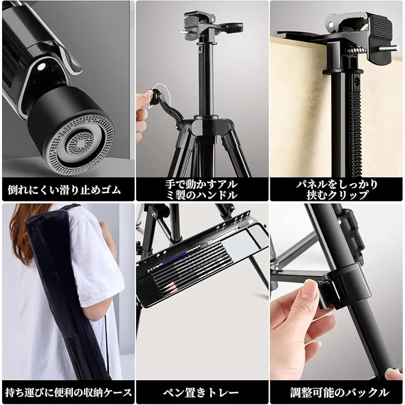 【高品質】55から160cmまでを調整可能なイーゼルは、回転ノブを通じて高さを調整でき、ニーズに応じて自由の高さ調整が可能です。 丈夫なスチールから作成したイーゼルスタンドなので耐久性が良く、丈夫さおよび安定性に優れています。すばらしい細工により、各素材の表面は精密研磨を施し、手を傷付ける心配はありません。