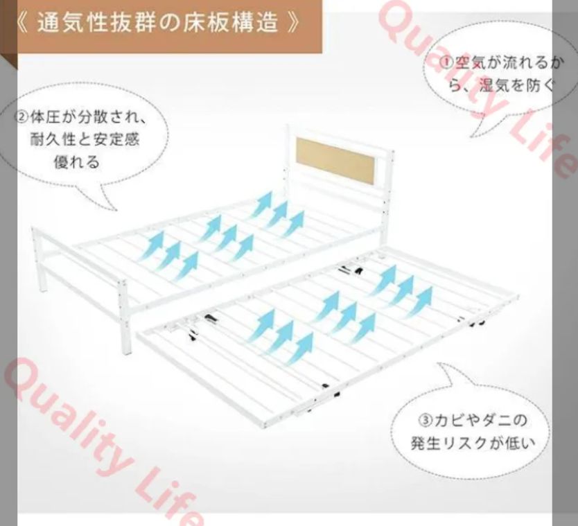 【空気流通性にも優れる】脚床面が高くなっているため、下の空間が通気性がよくなり、湿気やカビ、ダニの繁殖を防ぐことができます。さらに、重量を分散することで、安定感が増し、より安心してご使用いただけます。