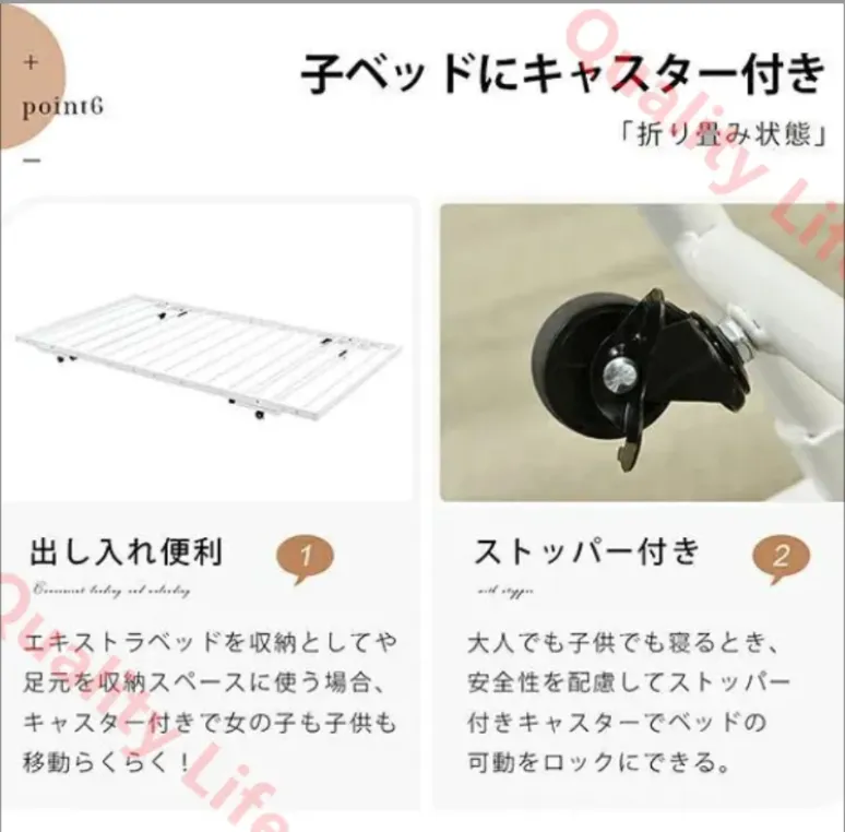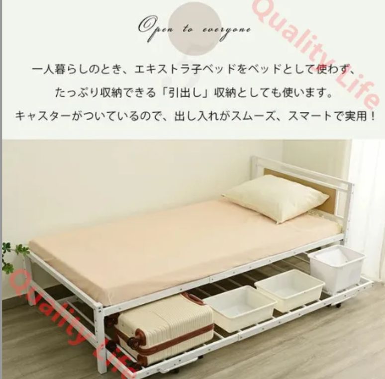 【足元の空間を有効活用】一人暮らしのとき、エキストラ子ベッドをベッドとして使わず、たっぷり収納できる「引出し」収納としても使います。キャスターがついているので、出し入れがスムーズ、スマートで実用!