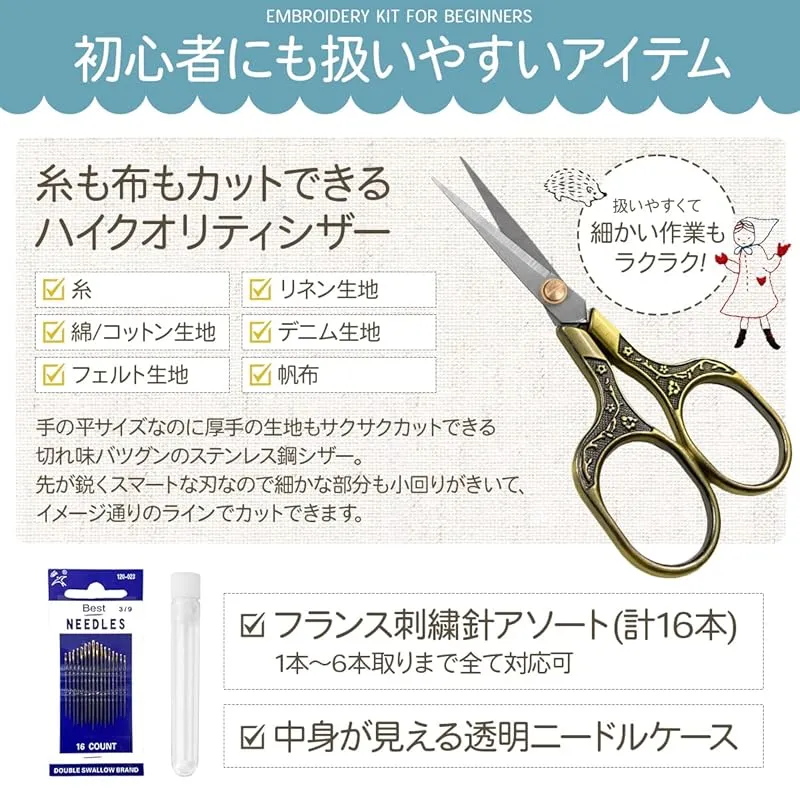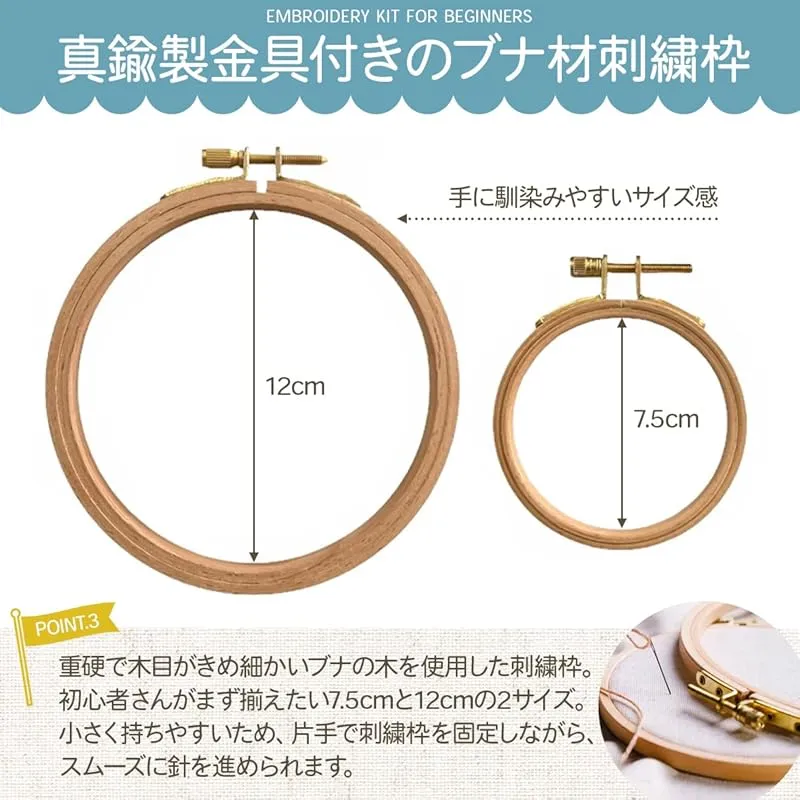 【こだわりの刺繍スターターセット】刺繍をはじめてはみたいけれど、何を揃えたらいいんだろう… と思っている方におすすめ! 刺繍を始める時に必要な道具一式が揃っています!刺繍の解説書、刺繍糸120色(ケース付き)、真鍮製金具付きの高級ブナ材刺繍枠7.5cm&12cm、フランス刺繍針アソート16本(No.3、No.5、No.7、No.10)、透明ニードルケース、お花の糸通し2個(カラーはランダム)、糸切りバサミ、リッパーをセットにしてお届け!可愛いデザインと機能性にこだわったオリジナル刺しゅうキットです。 ?
