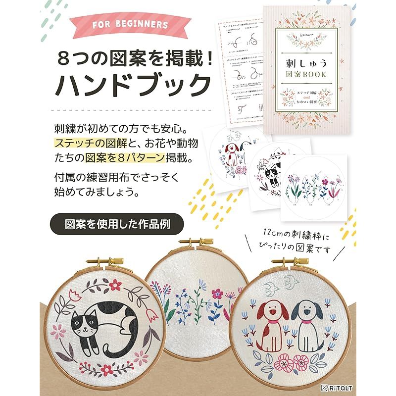 【図案付き】かわいい図案が掲載されたハンドブックをいっしょにお届けします。お花やどうぶつたちをモチーフとした図案は8パターン。12cmの刺繍枠にぴったりなサイズです。