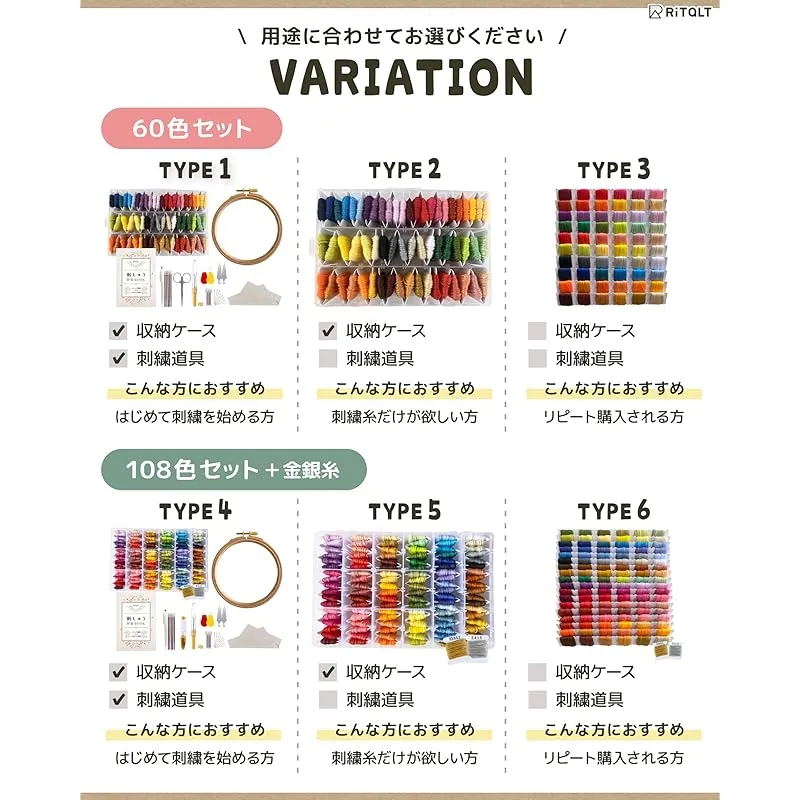 ■刺繍をはじめてみたい方におすすめの刺繍セット 刺繍をはじめてみたいけど、糸や道具をそろえるのが面倒・・と思っている方におすすめなのが、RITALT刺繍セット。