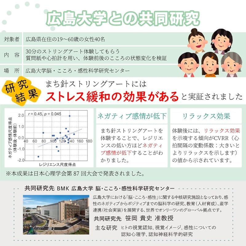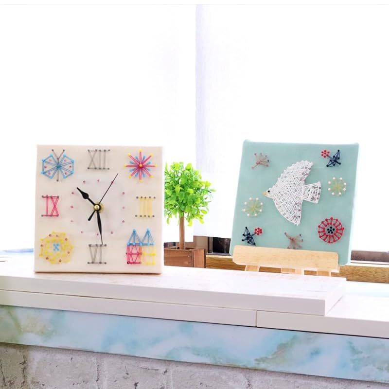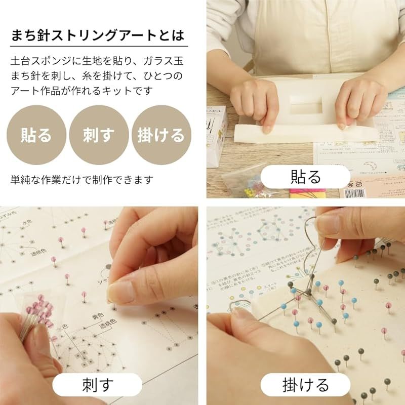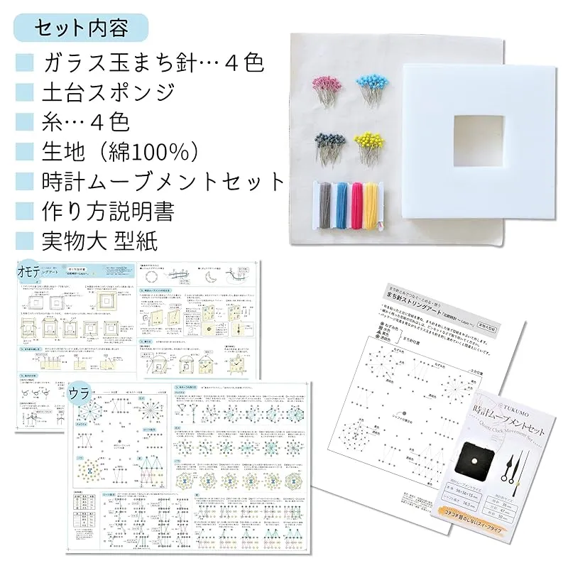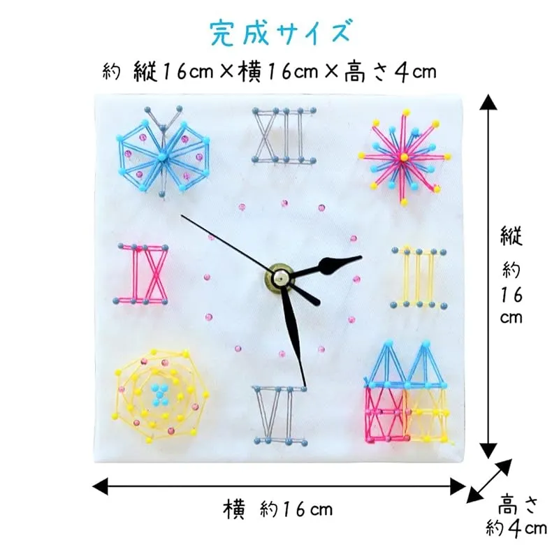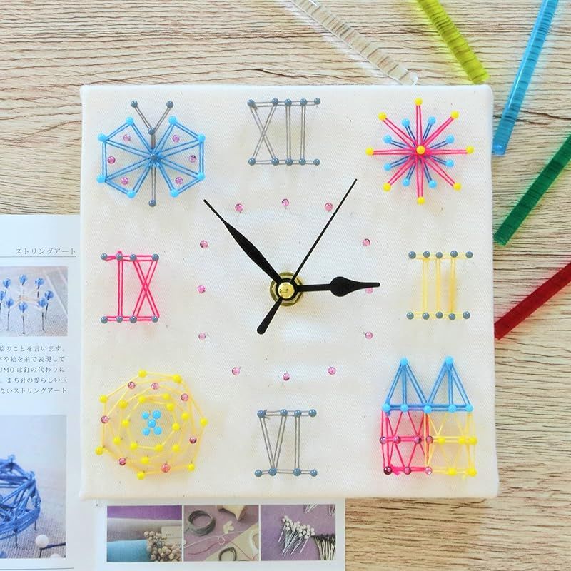 【刺す、貼る、糸をかける】という、単純な動作で制作することができ、経験や年齢を問わず誰でも楽しむことができます。 広島大学と共同研究を行い、まち針ストリングアートにストレスの緩和の効果があると実証されました!! ! 完成後サイズ(約);縦16×横16×高さ4 難易度;初級~中級。制作目安時間;120分 ※時計秒針が写真のモノと変更しております。(変更理由:秒針の付けやすさ向上に加え品質向上の為。)