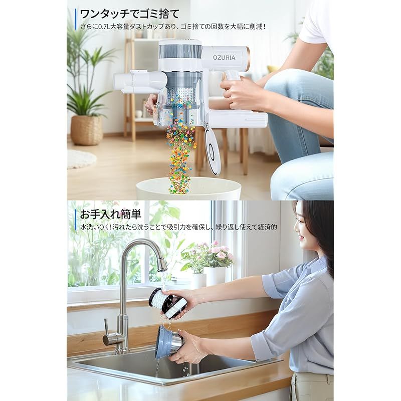 【75000Paの「減衰ゼロ」吸引力 & 交換式電池パック、充電待ちゼロの持続力】業界先端技術を盛り込んだ500Wブラシレスモーターに支えられて、モーターのエネルギーをサイクロン掃除機の吸引仕事率に最大限転換でき、驚きほどの75KPa吸引力に達します。市販のコードレスクリーナーはバッテリー残量が少なくなっても吸引力が低下になって、OZURIA掃除機はこのような心配がありません!弱/中/強 3段階のパワー調整で、畳の上の細かいホコリからカーペットにこびりついたペットの毛まで、一瞬で吸引。スティック掃除機は着脱式大容量バッテリーを搭載!最長60分間の駆動時間が、2LDKの部屋でも切れ目なくお掃除を実現します。予備バッテリー(別売)があれば充電待ち時間ゼロで連続運転可能、掃除のリズムを崩しません。??今ご注文いただくと、交換用バッテリーがもらえる!お気軽に説明書の連絡先より弊社までご連絡ください! ?
