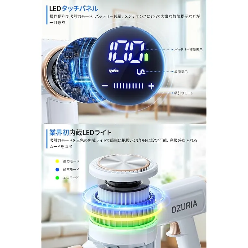 【業界初アンビエントライト&LEDタッチパネル】スティック掃除機の中身には3色アンビエントライトがあり、吸引力モードと連動して掃除状態を簡単に把握、ライトはON/OFFにカスタマイズ対応、掃除でも高級感あふれるムードを演出してくれます。さらに、タッチ操作可能な高輝度LEDパネルを採用し、モード切替、電池残量、また掃除機寿命にとって大事な故障提示機能も一目瞭然!スイッチ1回押すだけで連続運転開始、ボタンを押し続ける必要はありません。お年寄りや手が不自由な方にも優しい設計です。 ?