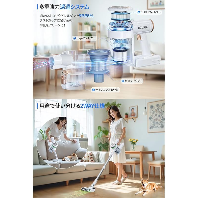 掃除機 コードレス 75000Pa【業界初 ムードライト登場】 OZURIA コードレス掃除機 自立式 着脱式バッテリー 60分間連続稼働 サイクロン掃除機 軽量 3段吸引力 スティック/ハンディ 2WAY LEDライト ハードフロア/カーペット/カーテン 0
