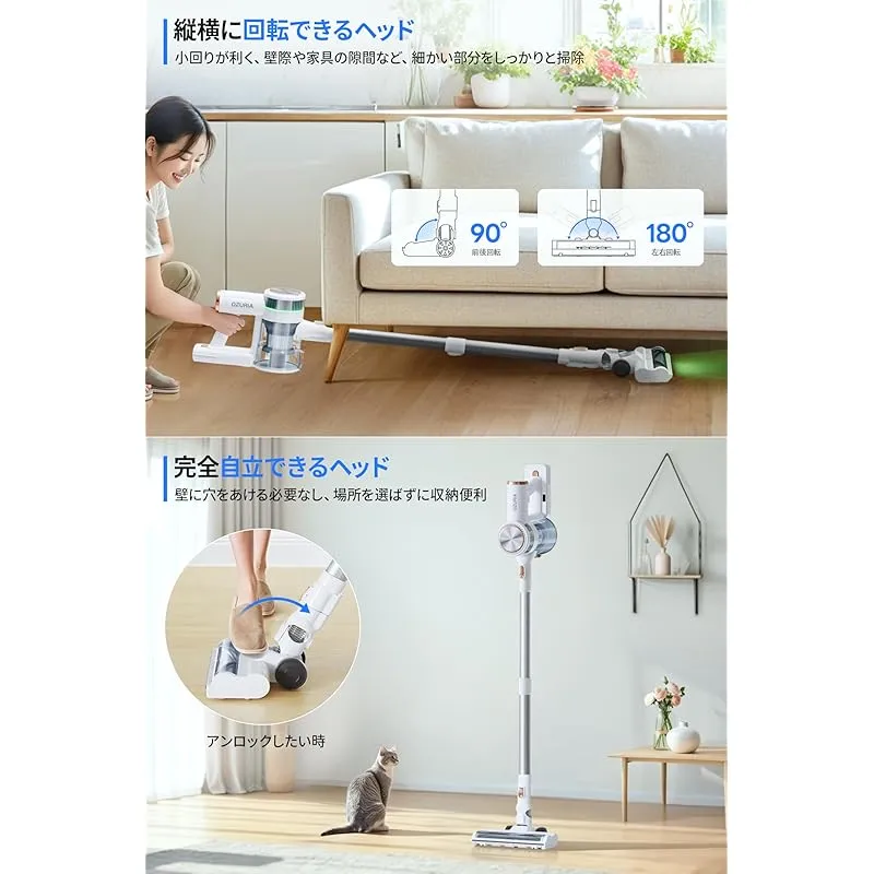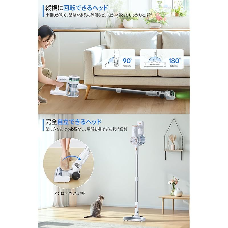 【75KPaの「減衰ゼロ」吸引力 & 交換式電池パック、充電待ちゼロの持続力】業界先端技術を盛り込んだ500Wブラシレスモーターに支えられて、モーターのエネルギーをサイクロン掃除機の吸引仕事率に最大限転換でき、驚きほどの75KPa吸引力に達します。市販のコードレスクリーナーはバッテリー残量が少なくなっても吸引力が低下になって、OZURIA掃除機はこのような心配がありません!弱/中/強 3段階のパワー調整で、畳の上の細かいホコリからカーペットにこびりついたペットの毛まで、一瞬で吸引。スティック掃除機は着脱式大容量バッテリーを搭載!最長60分間の駆動時間が、2LDKの部屋でも切れ目なくお掃除を実現します。予備バッテリー(別売)があれば充電待ち時間ゼロで連続運転可能、掃除のリズムを崩しません。 ?