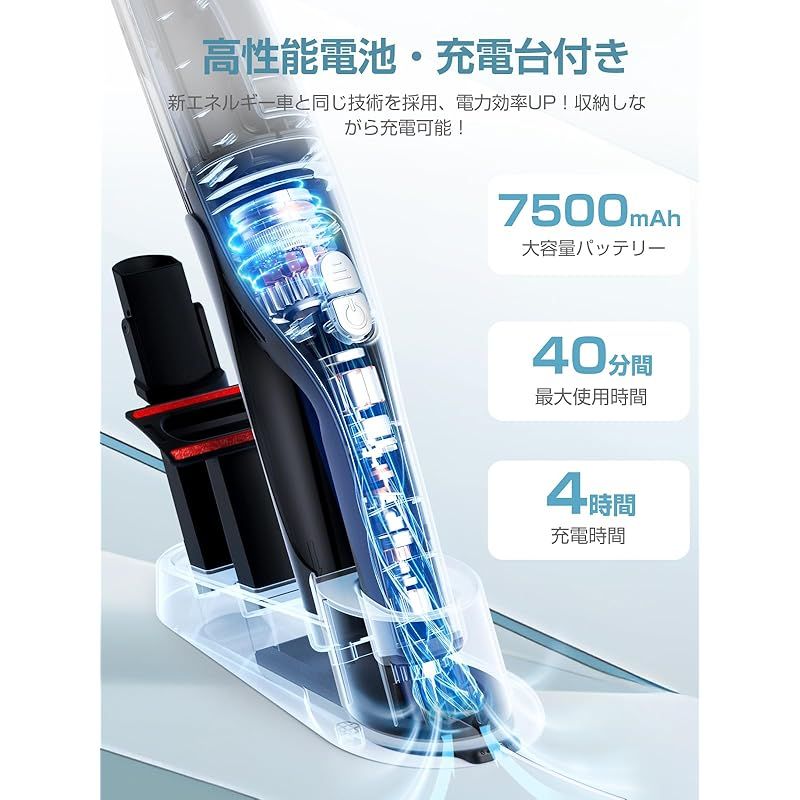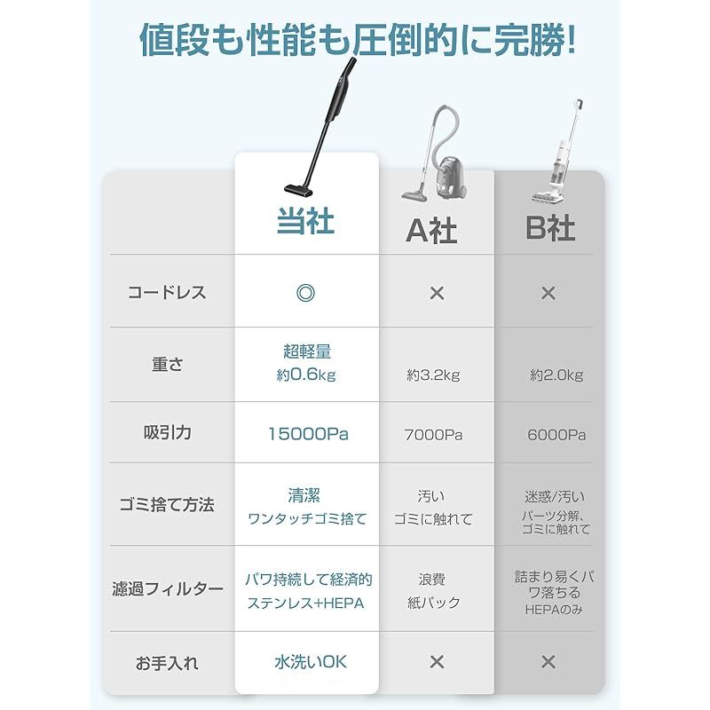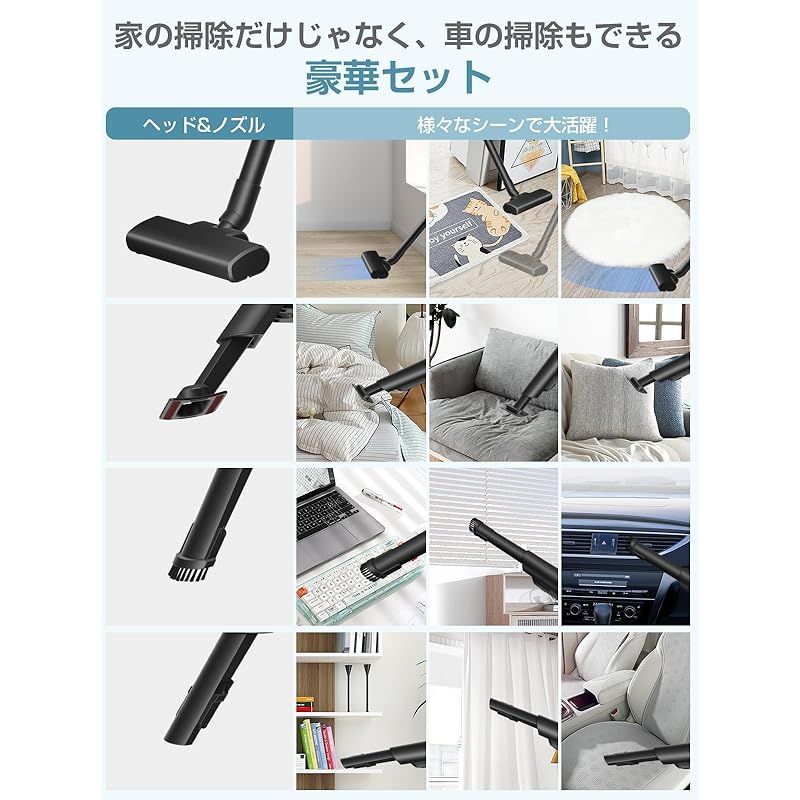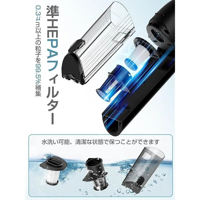 【15000pa強力吸引?多層濾過????お手入れ簡単】掃除機は120W最上クラスのブラシレスモーターを採用して、最大15000Paの吸引力をサポートし、フローリングの溝の吸引力は従来の5倍と、デスクの埃やゴミはもちろん、カーペットに入り込んだ砂や土などもしっかり吸い取れます。片手で使えて、全部屋は1台で掃除できます。また、フィルターやヘッドブラシは水洗いが可能なので、コードレスクリーナーを清潔に使えます。HEPAフィルターが2つ入ってるので、洗って乾くまで待たなくてもすぐにご利用できます。標準モード:吸引力約12000Pa 強力モード:吸引力約15000Pa ??