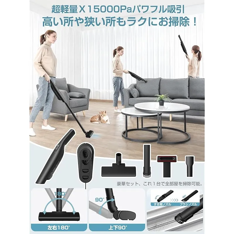【2025新登場】ハンディ超軽量 15kpa超強力吸引 スティックク リーナー ハンディvacuum cleaner cordless 電気そうじき 電気 2wayタイプ LEDライト付き 自走式 多重濾過 HEPAフィルター サイクロン式 充電式 Type-Cスタンド収納 一人暮らし 家庭用 車用掃除機 年末お掃除 日本語取扱説明書
