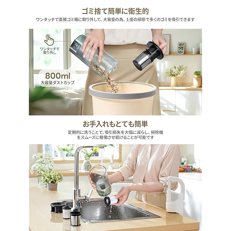 【業界初!800ml大容量ダストカップ!ゴミ捨て3秒完成】市販のコード式クリーナーのダストカップ容量は約500mlで、改良されたOzuria掃除機は約1.6倍となる超大容量800mlを実現!大きなリビングや全体のお掃除でも、頻繁にゴミを捨てる手間が省け、一気に清掃を完了できます!さらに、ゴミ捨てはワンタッチ式を採用して、面倒なロック解除は不要で、ボタンを押すだけで簡単に取り外せます。HEPAフィルターの清掃後も、カチッと音がするまで押し込むだけの超簡単装着、掃除の「面倒な手間」を徹底的に削減! ?