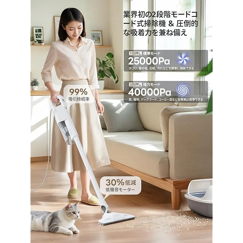 【コードレスよりコード式!持続かつ安定、フルパワーを維持】コードレスクリーナーの吸引力が不安定で、バッテリー残量が少なくなると吸引力が低下になったでしょう?コード式クリーナーは、コンセントから持続かつ安定した電力を供給するため、最初から最後までフルパワーを維持できます!そして、コード式スティック掃除機は黄金比パイプデザイン、遠心分離技術と弱モード25000Pa、強モード40000Paの最大真空度吸引力を実現でき、一人暮らしの部屋はもちろん、広いリビングや階段まで、「吸い取れない」という概念を根本的に打破した。深部に詰まった塵も、重いゴミも、一掃して!電源:AC100V(50/60Hz共通)。2025年10月18日から吸引力が新しくアップグレート! ?