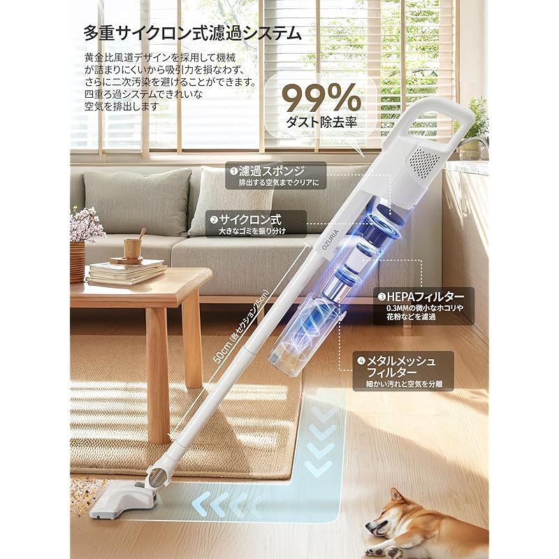 【驚異の99.7%! 微細なホコリも逃さない】使用時の不快感を解消するために特別に設計された排気口は、人間工学に基づいて絶対に顔や体に直接当たることがなく、排気口から出る空気がクリーンだから、アレルギー対策にも最適。Ozuriaサイクロン掃除機は新たな遠心分離技術の上、多重濾過サイクロンシステムを採用して、ゴミと空気をしかっり分離させ、0.3ミクロンの微小な埃や花粉まで99.97%吸込み、家中の空気まで、まるで浄化したような清潔感と快適さを! ?