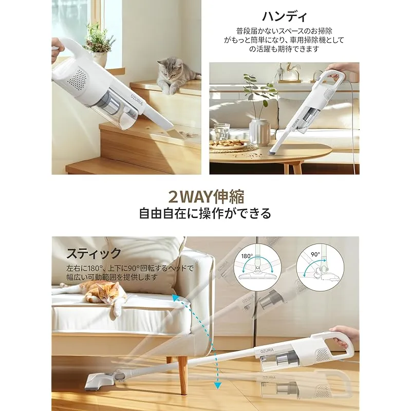 掃除機 コード式 40000Pa強力吸引 【業界初 2段吸引力 コード式掃除機】 超軽量 Ozuria サイクロン 2WAY仕様 ハンディ スティッククリーナー 多種類ノズル 遠心分離 5M電源コード HEPA多層濾過 紙パック不要 ハードフロア/カーペッ 0