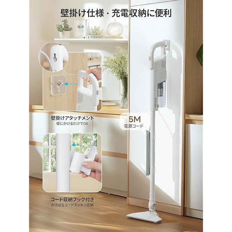【3年期間!電源切れの不安解消!】購入者は、梱包が破損または開封された商品には欠陷があると感じる場合は、出品者までご連絡ください、2025年9月からのご注文は3年期間付き、期間以内、無償交換/100%返金などのサービス提供いたします。※連絡先:「アカウントサービス」→「注文履歴」→「販売元」→「質問する」。コード式掃除機で、掃除途中でのバッテリー切れ、充電を忘れてしまった使えない…そんなストレスは一切不要!5?の長さでお部屋の隅々まで、掃除後、5?長さの電源コードをコードフックに巻き付けてしっかり収納でき、壁掛けアタッチメントで壁に立てかけることができます。 ?