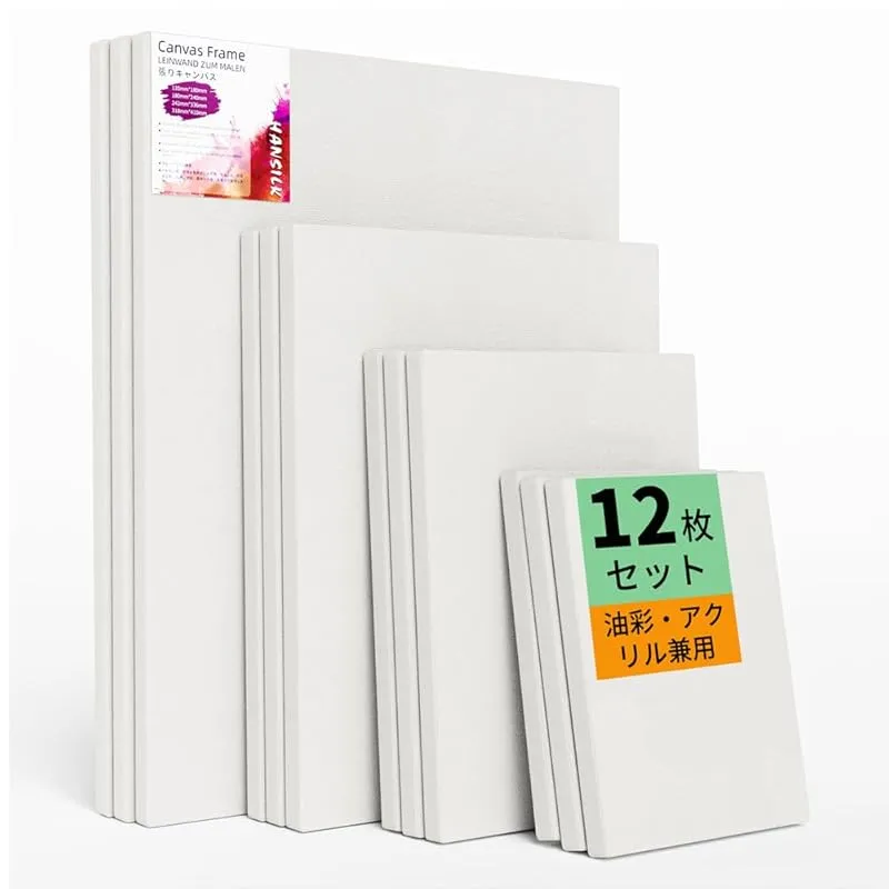 【12枚セット】 張りキャンバス 長方形 4サイズ各3枚 木枠 油絵キャンバス パネルボード 水彩画・油絵画・アクリル兼用 綿化繊 画材セット 厚手 オイル漏れ防止 壁に掛ける 部屋飾り アーティスト画布 0