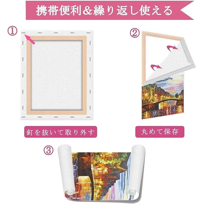 【携帯便利&繰り返し使える】:描かれたキャンバスは、釘を抜いて取り外すことができ、描かれている表面を外側にして、丸めて保存することができます。内側にして丸めると剥離する原因になります。残された木枠は、キャンバスを自分で張って再利用できます。軽いので携帯性に優れ、野外スケッチなどにも向いています。