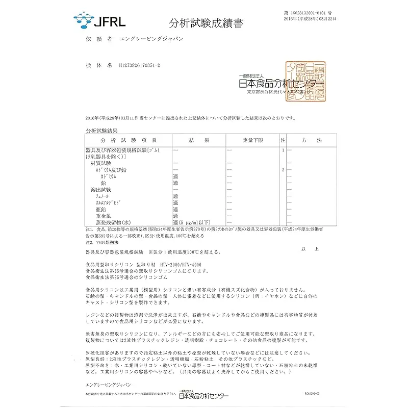 【商品概要】 ★無害、無臭、低粘度の型取りシリコンなので初心者の方にも安心になります。 ★食品・チョコレート・透明樹脂・レジン・キャンドル・石鹸などの複製が可能になります。 ★低粘度なので一般のお客様でも製作が可能になり、完成後のシリコン型の耐熱温度は200℃まで可能になります。 ★HTV-4000の使用方法:液体タイプのA材とB材をヘラなどでしっかり混合(2分間ほど)してから原型を入れた枠に注ぐと8時間後(23℃)にメス型のシリコンゴムになりますので中性洗剤などで洗浄してから型にバターなどを塗りチョコレートなどを流してください。 ★付加式食品等級タイプ 乳白色半透明 比重1.10 硬度32 粘度7500 伸び率260% 収縮率0.1% 引張強さ5.5Mpa 引裂強さ25kN/m 作業時間25分 脱型時間8時間(23℃)※説明書添付※内容量1KG(500g×2)セット
