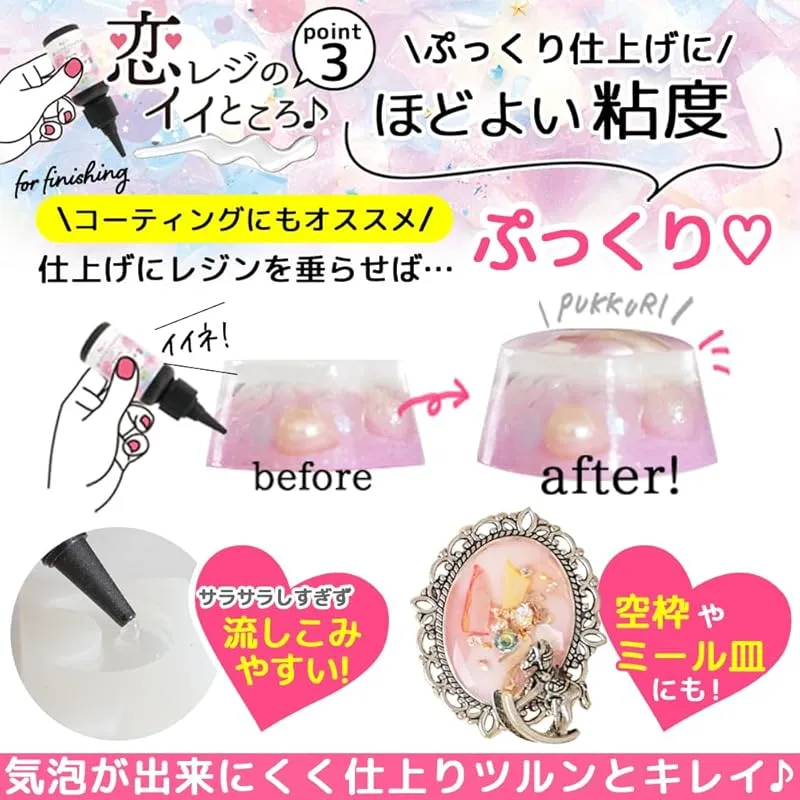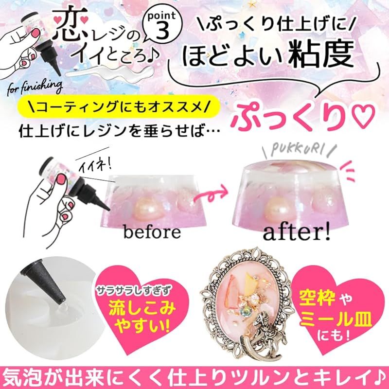 【恋レジのイイところ♪その ほどよい粘度♪】ケラッタの恋レジは流しこみやすいほど良い粘度♪モールドはもちろん、空枠やミール皿にも流しこみやすく、作業がしやすい! また、さらさらしすぎないテクスチャーだから、仕上げ用にもお使いいただけます♪ぷっくりかわいく仕上げたいときにオススメ!