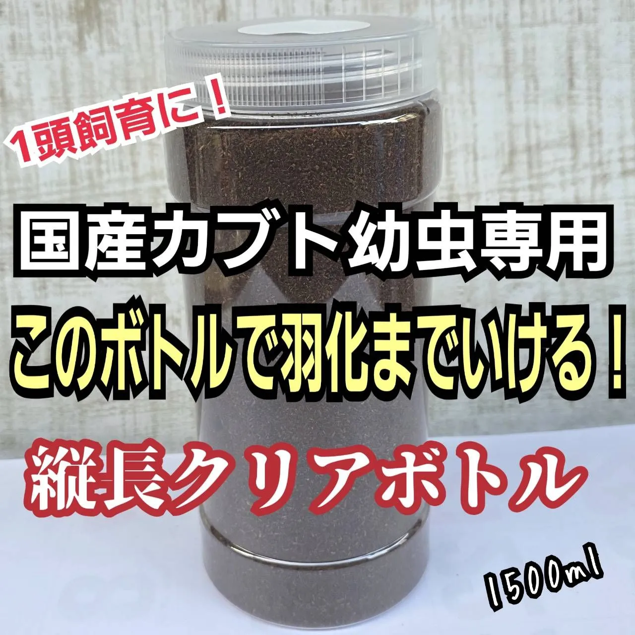 クリアボトルで中が良く見えて幼虫、サナギ、羽化まではっきりと観察できるこだわりのボトルに栄養たっぷりの発酵マットを詰めて発送致します。