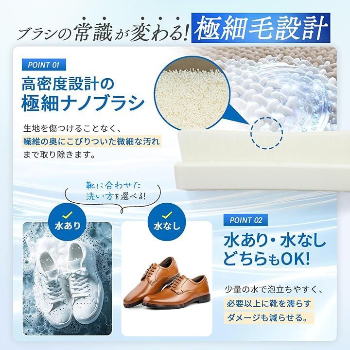 「水あり・水なし両用でいつでも手軽」 スニーカーや上履きのしっかりとした水洗いはもちろん、革靴など水を使いたくない素材のお手入れもこれ一本で対応可能です。