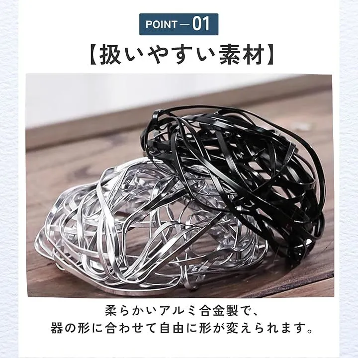 「扱いやすい素材」柔らかいアルミ合金製で、器の形に合わせて自由に形が変えられます。