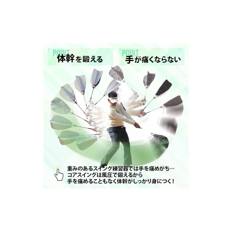 【手が痛くならない】空気抵抗で練習するタイプだから、手や手首など体を痛めることなく、しっかりとスイング練習ができます。体の回転を使って素振りを繰り返すことで、腰の回転を使った正しいスイングフォームが自然に身につきます。