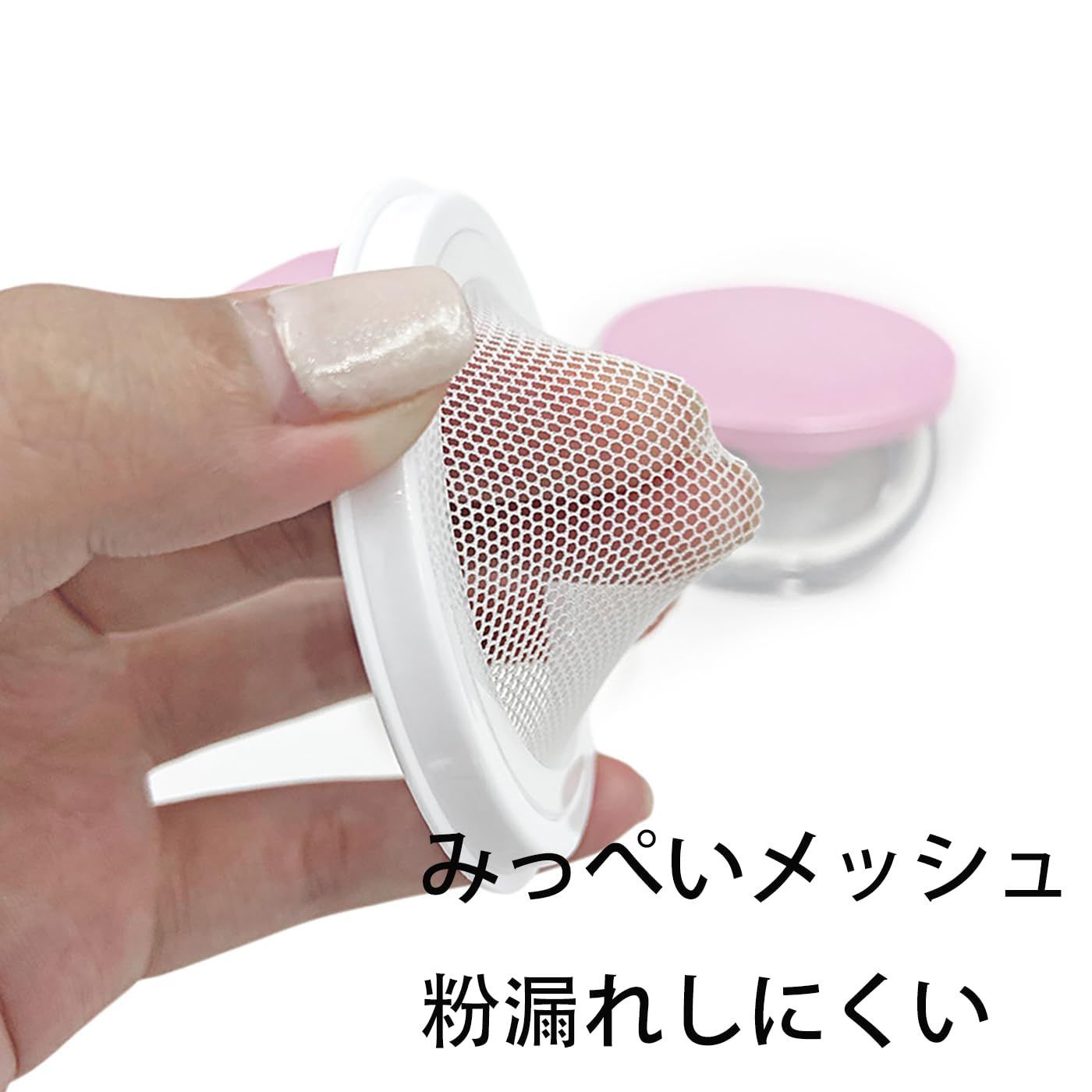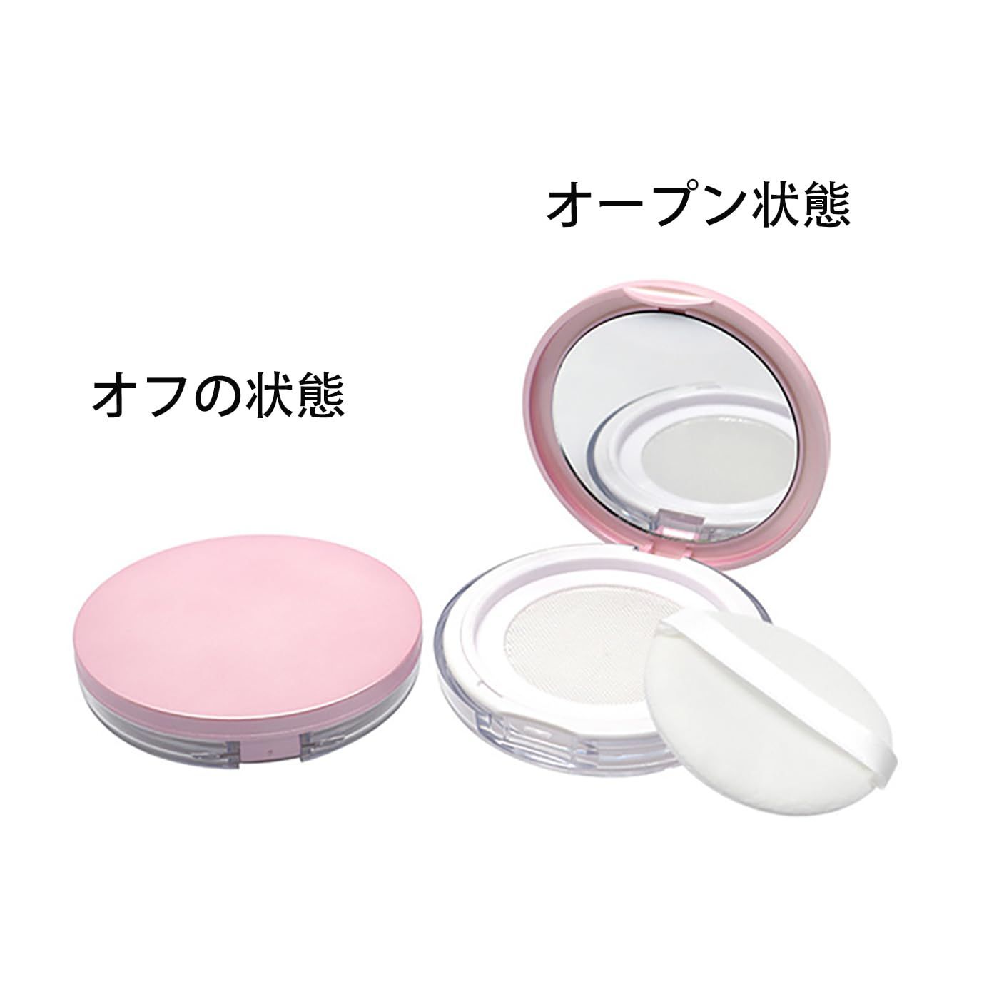 このパフは、粉化粧のアプリケーションに使用します。スポンジを使って粉を拾い、顔にアプリケートします。鏡付きケースには、スポンジと粉を一緒に保管して持ち運ぶことができます。スポンジは使用後、洗浄してください。