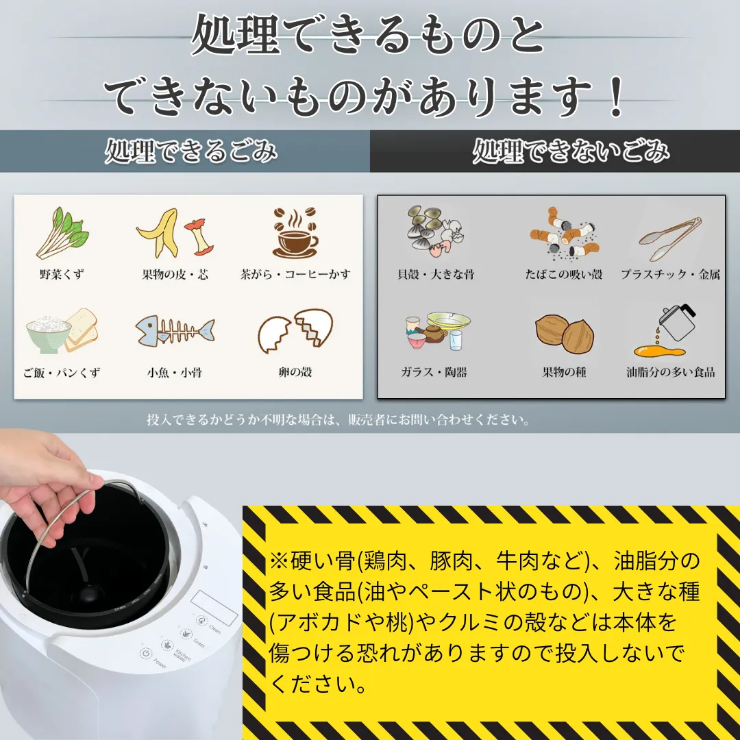 投入前に大きな骨・種・貝殻・異物は取り除いてください。