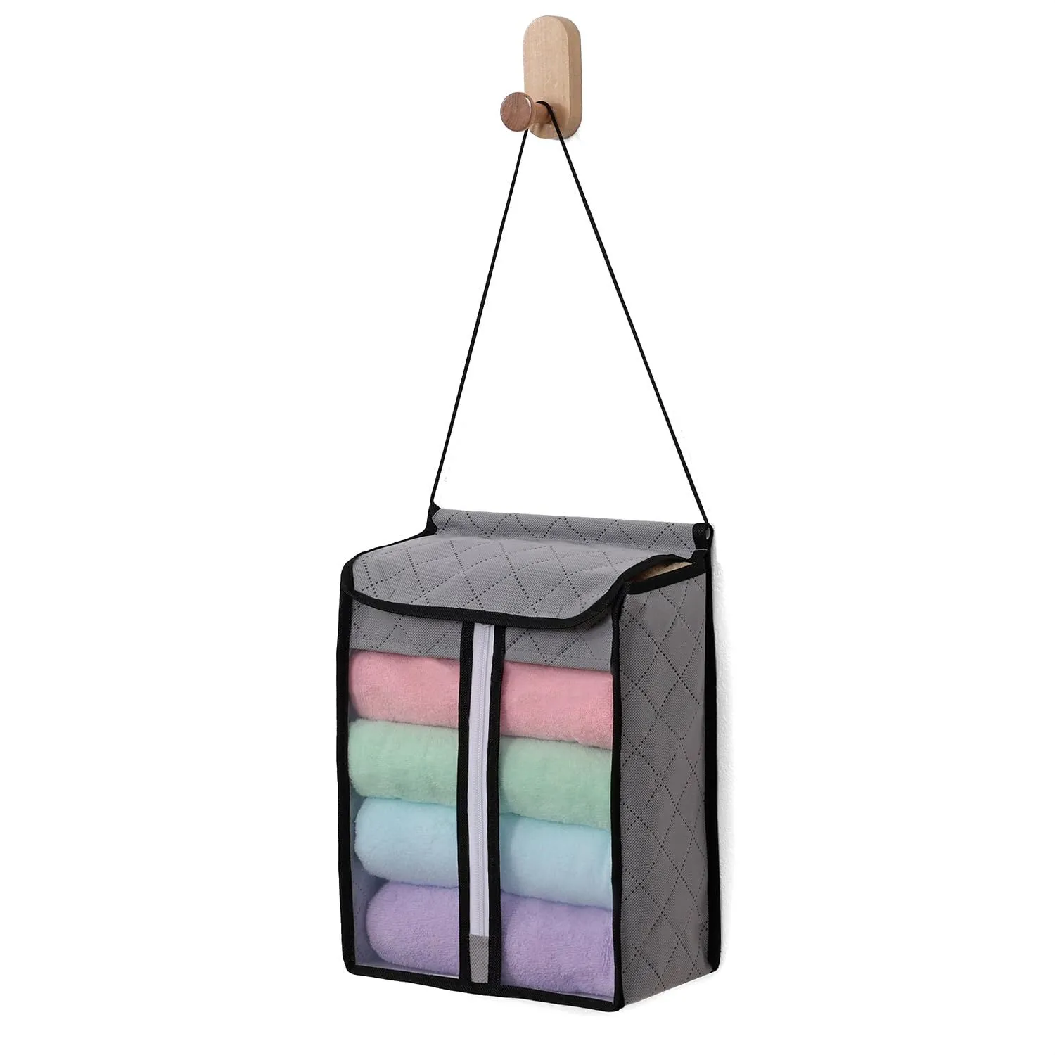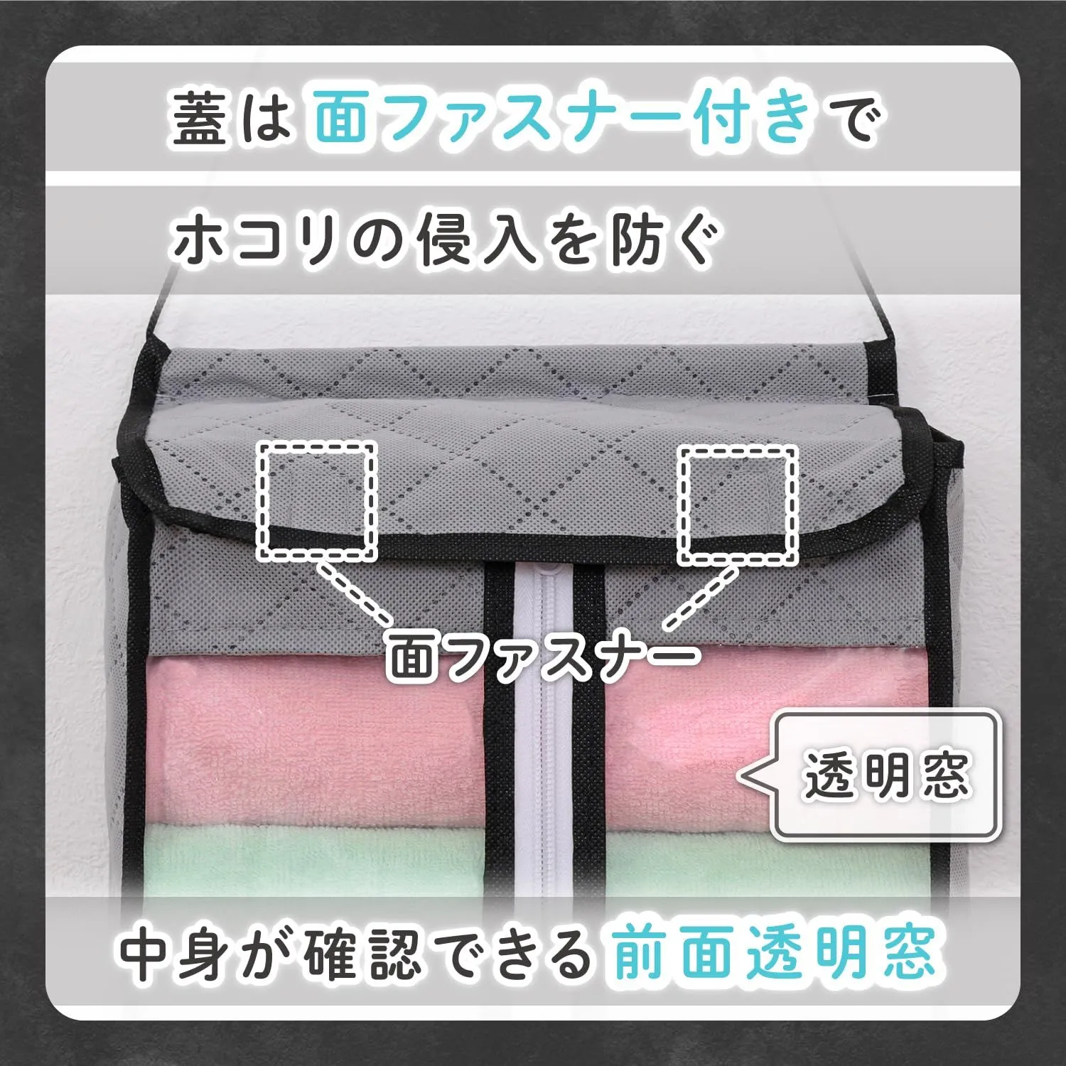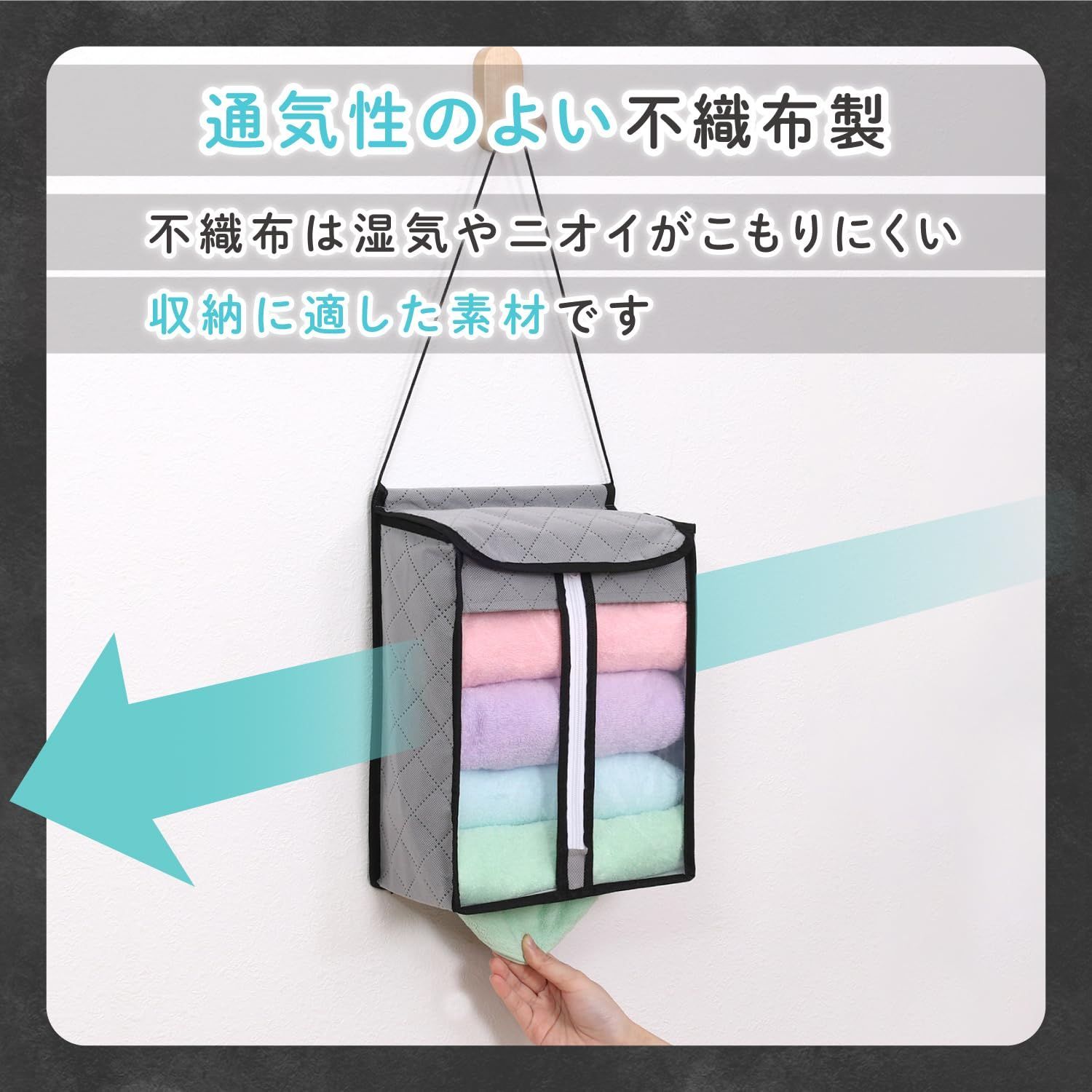 【タオルストッカー 壁掛け 吊り下げ】 通気性の良い不織布製 活性炭の力でタオルを消臭保管 タオルホルダー フェイスタオル 保管ケース ランドリー収納 洗面所 洗面台 タオル入れ 透明窓付き 171-92