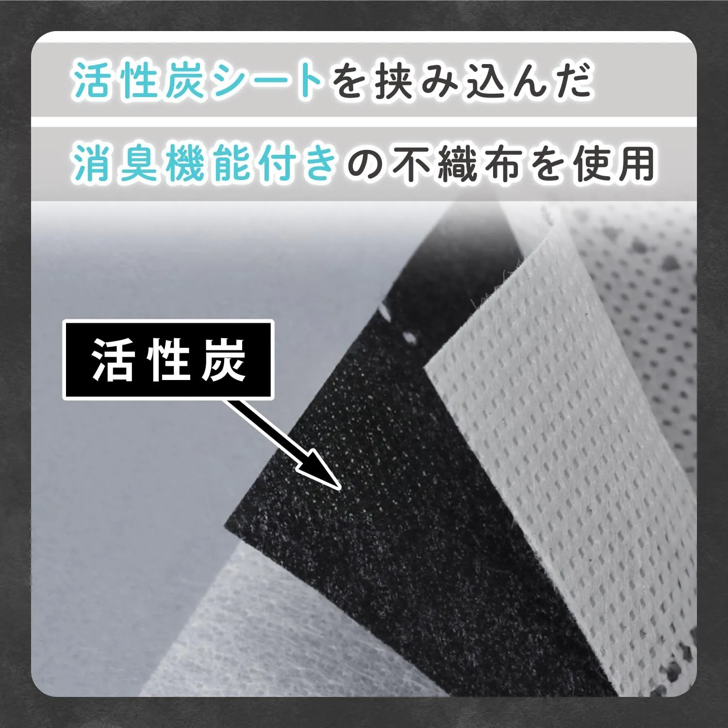 【活性炭のチカラで消臭保管】:活性炭が空気中のにおいの元となる物質を吸着し、タオルを消臭しながら保管できる。