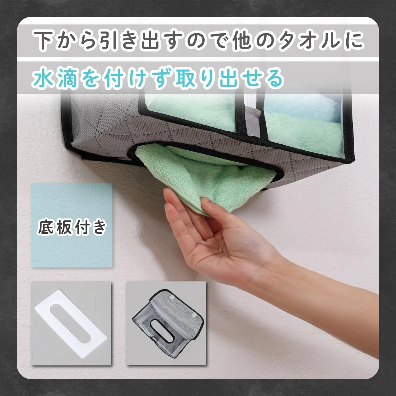 【吊り下げタオルストッカー】:フェイスタオルを下から1枚ずつ取り出せる、通気性の良い不織布製のタオル収納ケース。