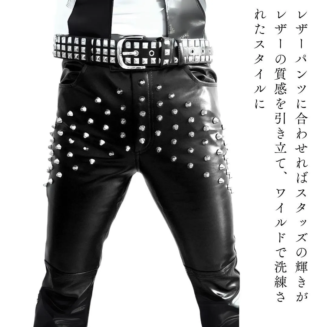 パンク・ロック・V系スタイルに定番のクールな3連ピラミッドスタッズベルトです。シンプルな装いにも一癖与えるアクセントに。