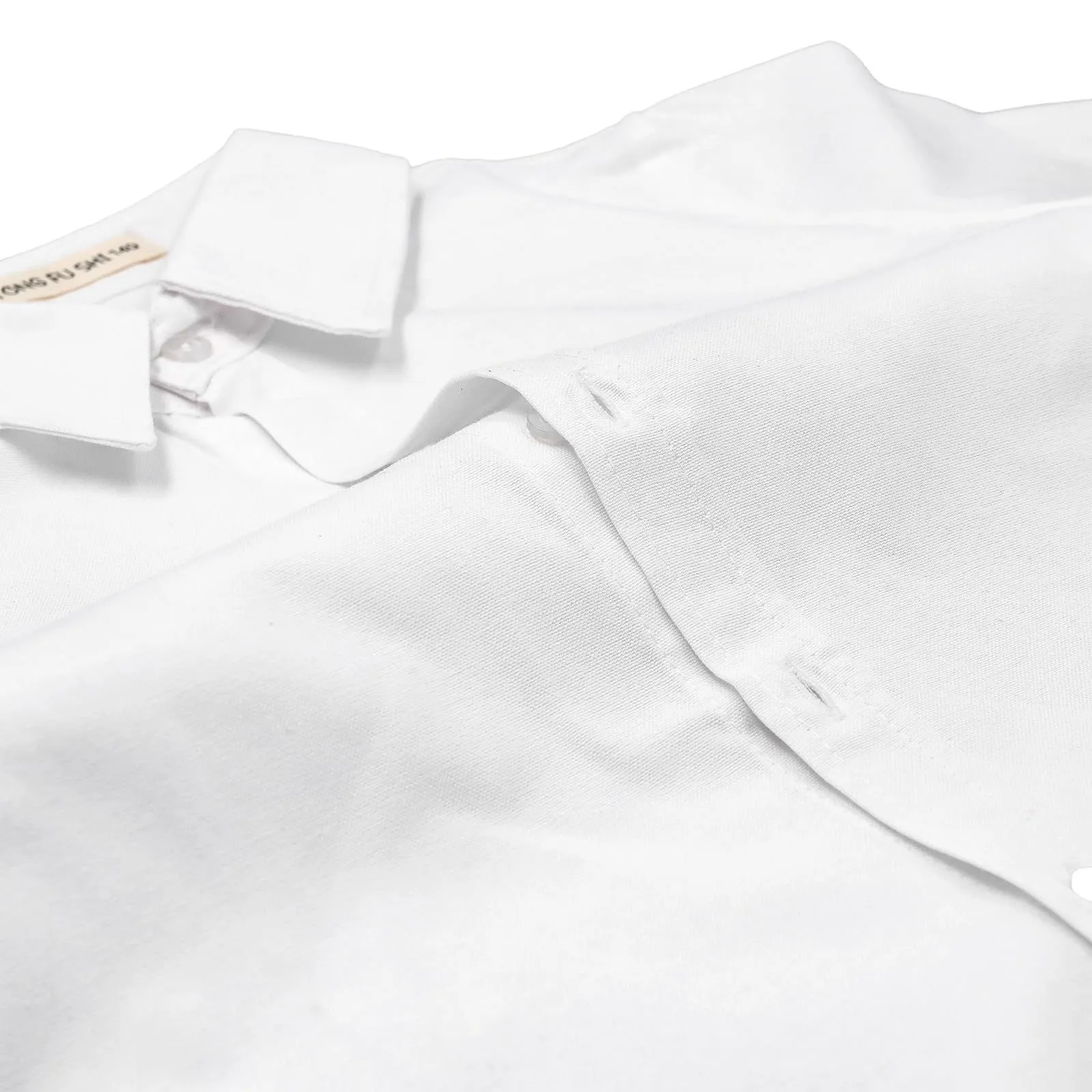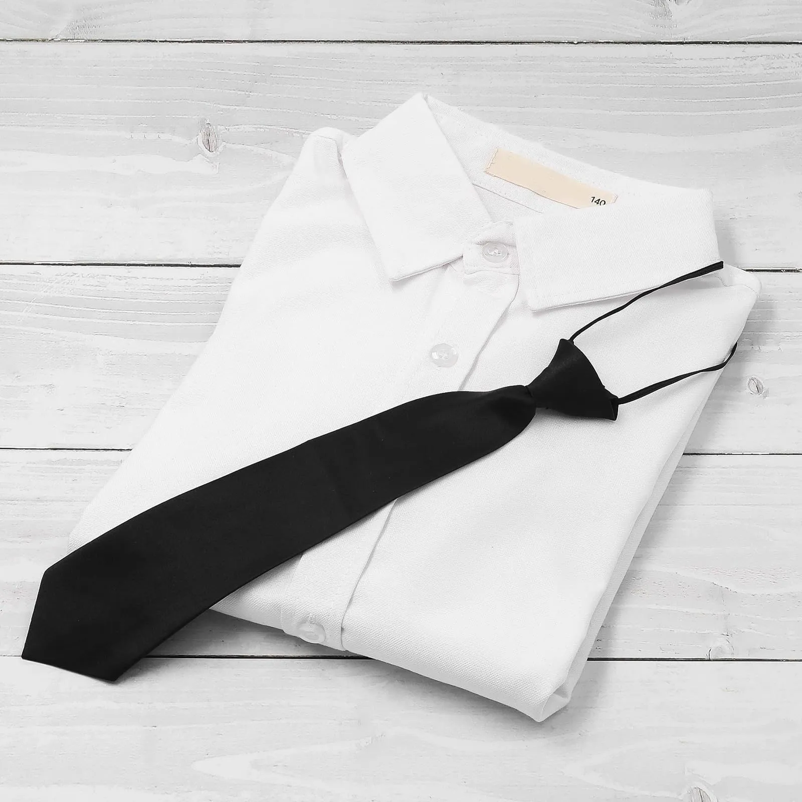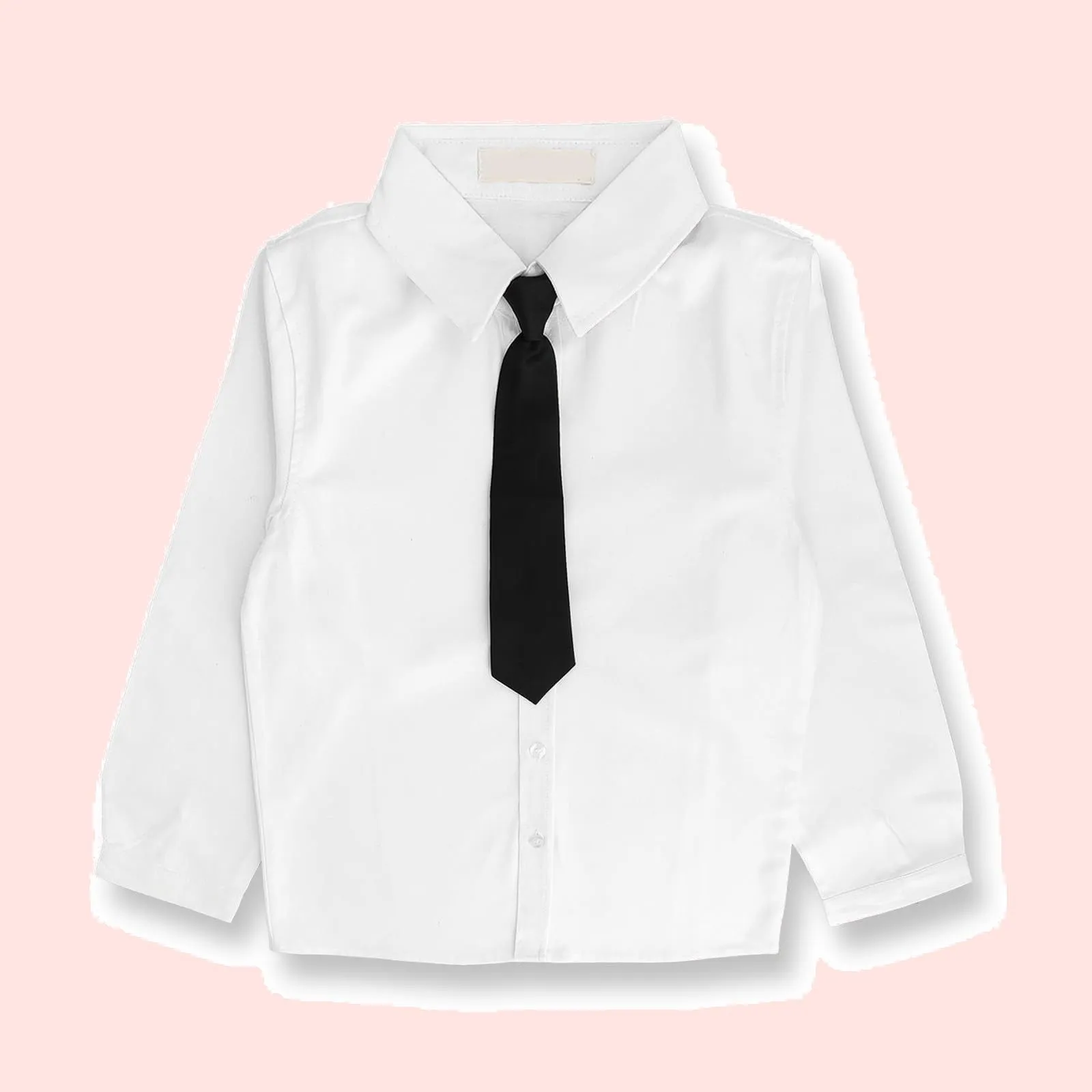【フォーマルな印象】お子様の大切な日を彩る、ネクタイ付きの白い長袖シャツです。入園式や卒園式、入学式などのフォーマルな場面で、清潔感と品格を演出します。シンプルながらも上品なデザインで、記念写真にも映える一枚です。