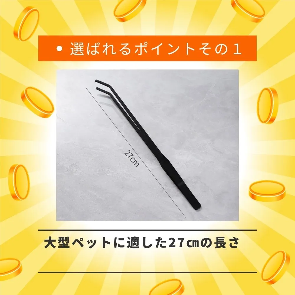 この30㎝のステンレス製ピンセットは、大型の爬虫類や両生類の餌やりに最適です。手の大きな成人男性でも十分な距離を保ちながら、餌やりができる設計です。耐久性があり、サビにくいステンレス製で、先端が滑りにくい形状のため餌を掴みやすいです。また、ペットが噛んでも歯や顎を痛めにくい仕様になっています。