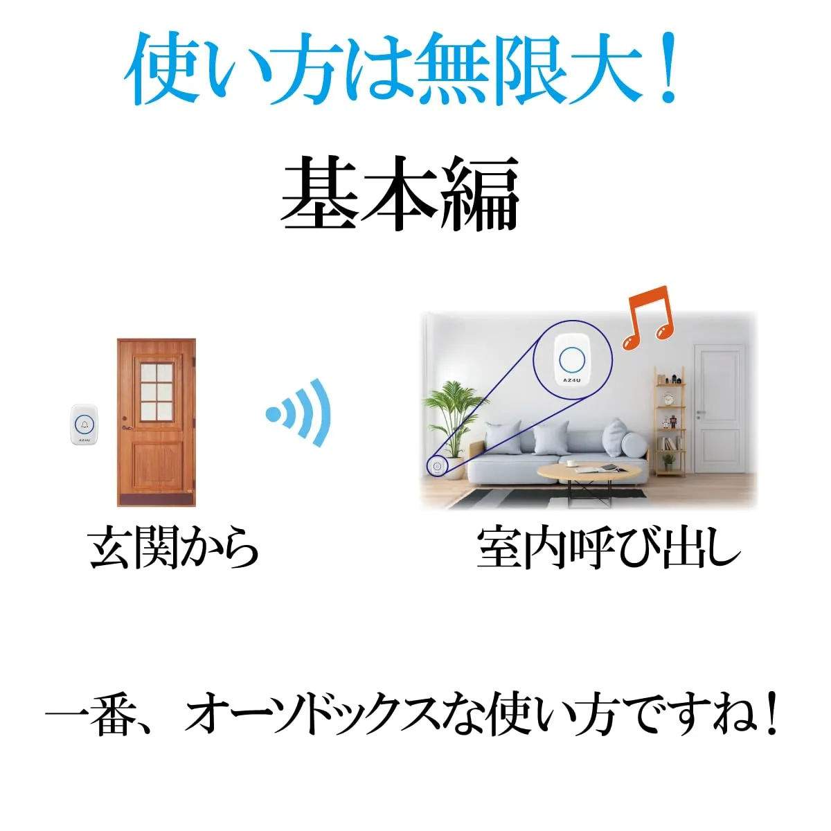 AZ4U ワイヤレスチャイム インターホン 電池式 ドアベルキット 工事不要 防水 玄関 介護 呼び出し 60種類のメロディ 4段階音量調整 ホワイト