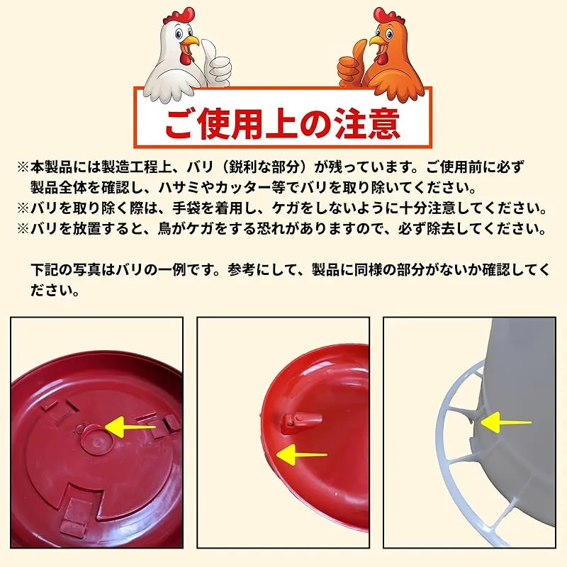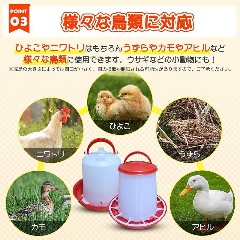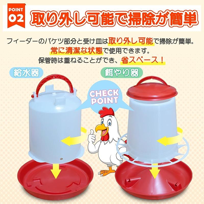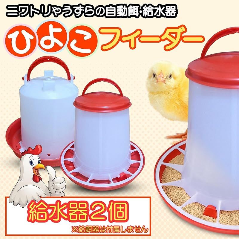 【商品概要】 うずら、ひよこ、にわとりに自動で餌やり・水やりができる、給餌器と給水器です。別名、ひよこフィーダー・チキンフィーダーとも。 エサ入れの受け皿には仕切りがあり、複数の鳥が食べるのに便利な形状を採用。エサが均等になり無駄のないエサやりが可能です。 餌入れ、水入れともにフィーダーのバケツ部分と受け皿は取り外し可能で掃除が簡単。常に清潔な状態で使用できます。保管時は重ねることができ、省スペース。 餌やり機は、上部の蓋を取り外し、餌を投入します。給水機は、容器は逆さにひっくり返して水を入れます。エサ、水はフィーダー部から受け皿に自動供給され、溢れることはありません。 鶉、雛、鶏はもちろん、カモやアヒルなど様々な鳥類のエサやり、水やりに使用可能。ウサギなどの小動物にもOK ※成鳥の大きさによっては餌口が小さく、餌の摂取が制限される可能性がありますので、ご了承ください。※本製品には製造工程上、バリが残っています。ご使用前に製品全体を確認し、バリを取り除いてください。