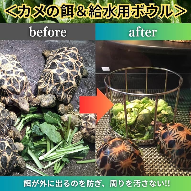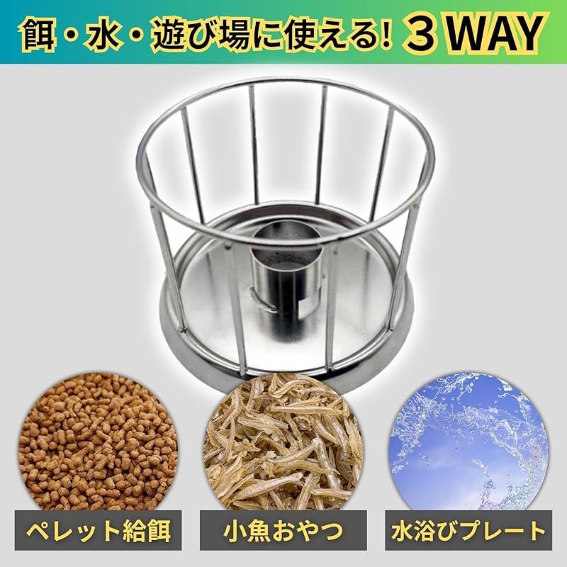 【商品概要】 高品質な304ステンレス製で錆びにくく、長く使える安心設計。周囲に付いたガードがカメの足によるエサの踏み荒らしや水汚れを防ぎ、清潔で衛生的な食事環境を実現。バクテリアの繁殖を抑え、ペットの健康をしっかりサポートします。 底面は丸みを帯びた滑らかなデザインで、エサのカスが残りにくくお手入れ簡単。水でサッと洗うだけで清潔さをキープできるので、忙しい飼い主さんにもおすすめ。食器洗い感覚で簡単に使い続けられます。 中央の専用穴に市販のペットボトル(口径約3cm)を差し込むことで、自動給水機としても活躍。カメがいつでも新鮮な水を飲めるので安心。給餌と給水の両方が1つでできる、多機能な便利ボウルです。 全体が丸みを帯びた滑らかな構造で、カメが口や手足を傷つける心配がありません。手すり部分も安心の幅設計で、複数匹のカメが同時に使用してもトラブルになりにくい設計。爬虫類全般にも使用可能です。 直径11.5cm×高さ8cm、手すり幅3cmとコンパクトながら広々使えるサイズ。複数匹のカメが同時に餌を食べられるので、争いのストレス軽減にも効果的。毎日の餌やりがもっと快適に、そして効率的になります。