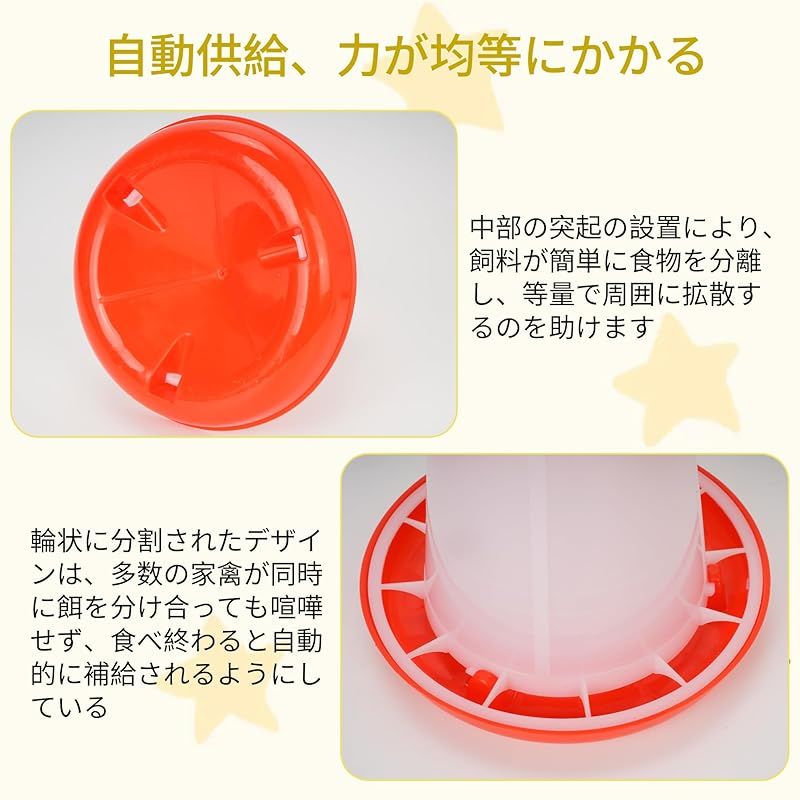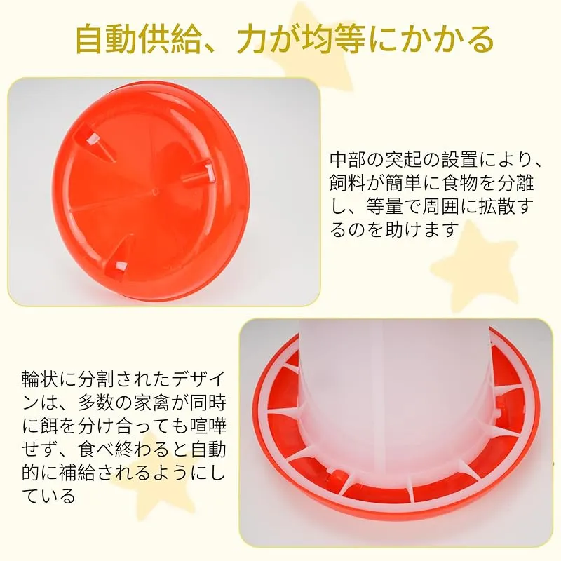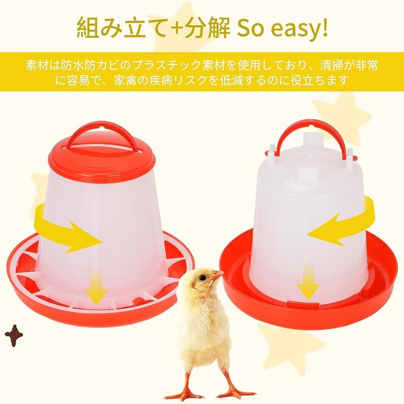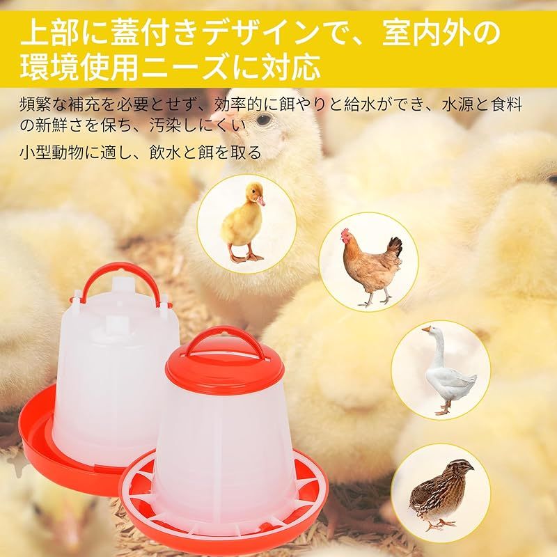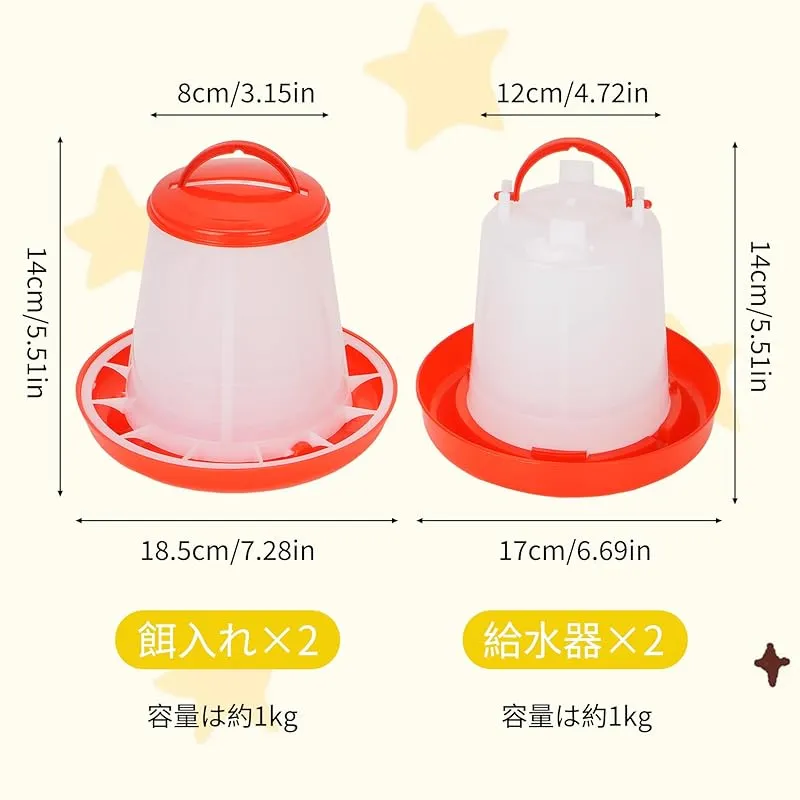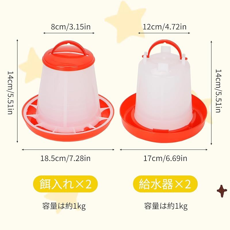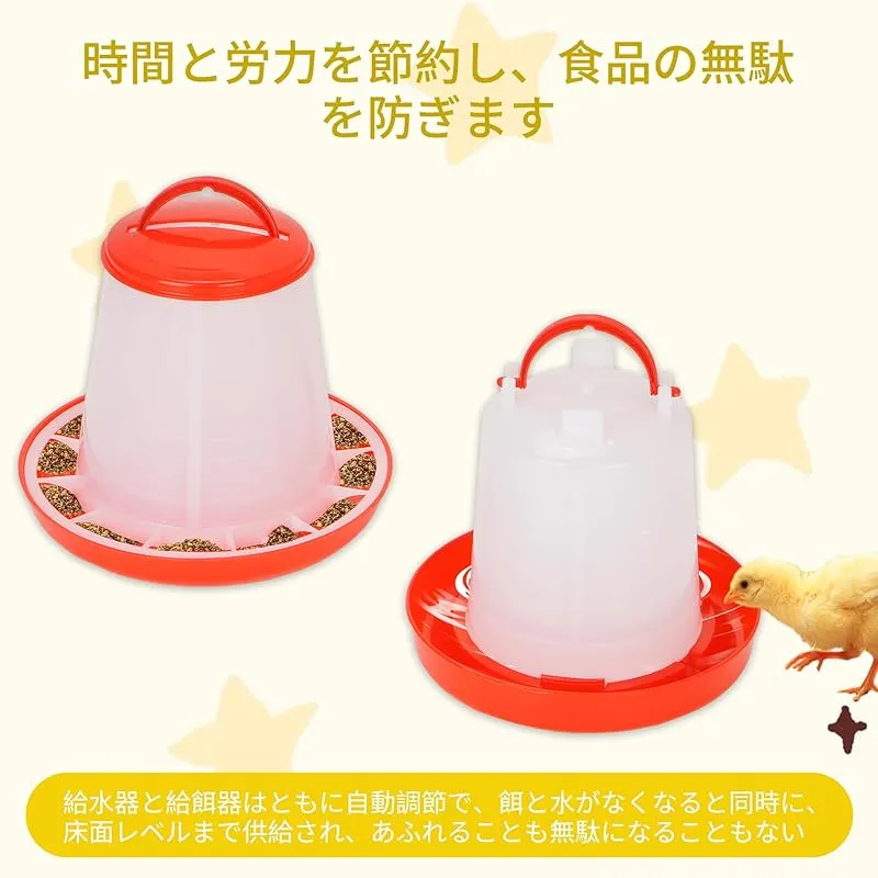 【商品概要】 時間と労力を節約し、効率的な給水給餌器:鶏餌入れ水やり器くみあわせせせは簡単な操作を行うだけでよく、トレーの水位と食べ物の減少に応じて自動的に補充する構造で、頻繁な補充時間を回避し、飼育者の毎日の世話の負担を軽減することができる。毎日を楽にして、たくさんの時間を解放して生活を楽しむことができます 心をこめて設計する、力を受けるのは均一である: 鶏自動給餌器自動給水器組み合わせは全体的に上部カバーの設計を採用して、食品と水源が汚染され、新鮮ではないことを避けることができる。食水口と食口の間隔はすべて科学的な実験を経て、動物がバランスよく食べ物と水を摂取することをして、浪費しにくい。より良く小動物たちの健康な成長を助け、安定した栄養供給を与える 高品質材料:ニワトリ用自動給水器餌やり機組み合わせは何度も実験を経て材料を選択し、この高品質プラスチック材質を確定した。耐久性に優れ、防水で汚れにも強く、アウトドアにも最適です。全体的に定番の紅白配色を採用し、どこに置いても飼育者の日常を明るくすることができます 2セットの組み合わせで、自由にDIY:家禽自動給餌器自動給水器組み合わせの上部は取っ手の設計を採用して、携帯しながら移動しやすいです。ウズラ、ヒナ、ニワトリだけでなく、アヒル、アヒルなどさまざまな鳥の餌や水やりにも使用できます。本製品は給餌器1 KG容量2個入+給水器1 KG容量2個入を含み、需要に応じて自由に製品を組み合わせ、飼育需要に柔軟に対応できる 設置が簡単:鶏自動給餌器のサイズは18.5×14×8 cm、鶏自動給餌器のサイズは17×14×12 cmである。上部とトレイは取り外し可能な設計であり、これにより清掃が容易になり、衛生環境を維持し、家禽の健康を保護し、病気のリスクを減らすことができる。水飲み器は回して水を置くことができ、餌箱は蓋を開けて食べ物を置くことができる。あなたの家禽飼育のお手伝いです