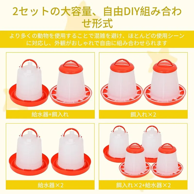 【商品詳細】 ブランド:rloao 商品種別:鳥の餌入れ 商品名:rloao 鶏 餌入れ 水飲み器 大容量 自動給水器 自動給餌器 鳥 アヒル チキン うずら用ペット 放し飼い 餌やり エサ台 プラスチック ポータブル フリーDIY 置き換えが容易 家禽 給餌 給水セット(給餌器1KG 2個+給水器1KG 2個) 製造元:rloao 商品番号:JPG5-51-0026 商品内容:標準 色:赤+白
