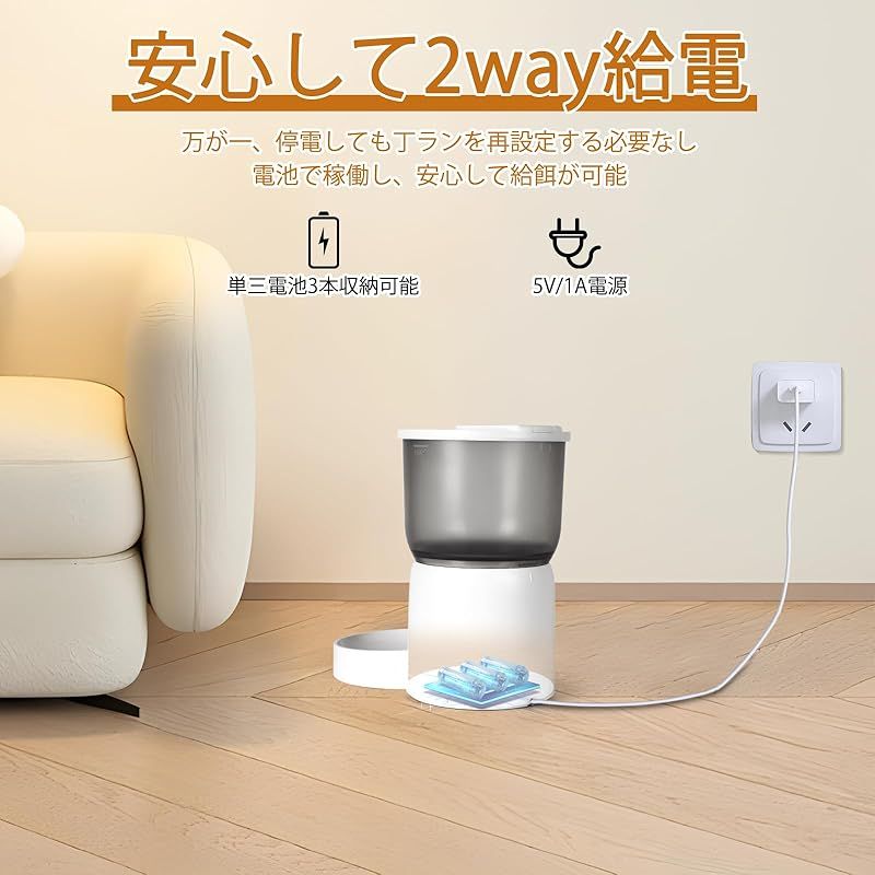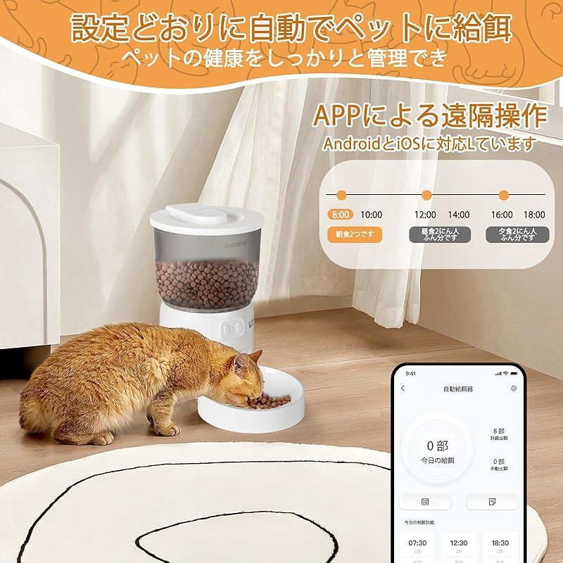 【商品説明】 このSeiraku自動給餌器は、猫の飼い主にとって最適なペット用品です。3L大容量のペットフードストッカーを搭載し、多量の餌を保存可能で、長期間の外出時も餌切れを心配する必要がありません。 遠隔操作機能は、専用アプリ(対応済み)を通じて、外出先からでも事前に設定した給餌スケジュールを実行できます。例えば、平日の朝・晩の給餌時間や週末の特別な餌量をリアルタイムで調整し、猫に決められたタイミングで餌を提供します。 寝返り防止機能により、猫の活発な動きで給餌器が転倒するのを防ぎ、餌の無駄遣いを抑えます。早食い防止機能は、猫が一気に大量の餌を食べ過ぎるのを阻止し、健康的な食事習慣を育てるのに役立ちます(特に子猫や食べ過ぎ気味の猫に最適)。 付属の猫用餌皿・食器セットは衛生的で洗いやすく、餌をスムーズに供給します。また、ペットフード保存容器としても機能し、内部の乾燥剤で餌を新鮮に保ちます。猫専用の可愛いデザインは、家庭のインテリアにも調和します。