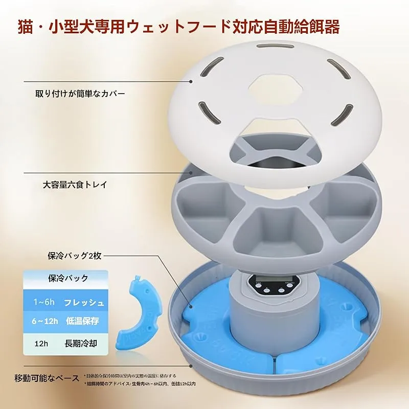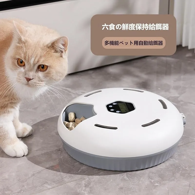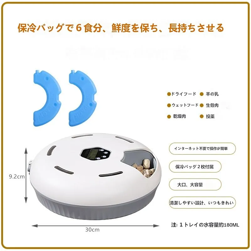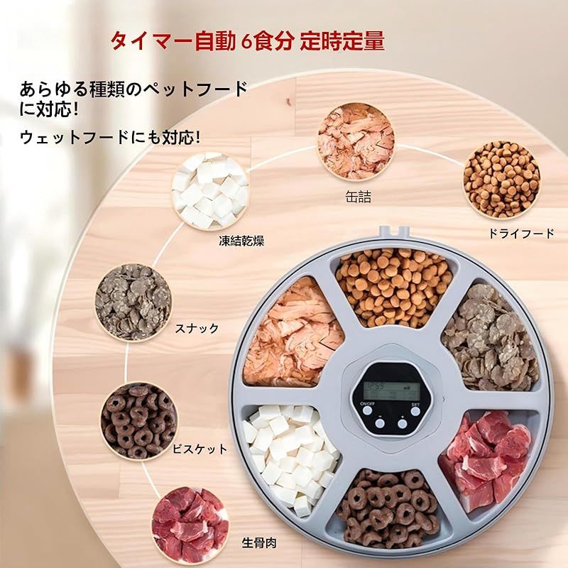 【あらゆる種類のペットフードに対応】:24時間ごとに繰り返すタイマーが設定できるから、6つのボウルにそれぞれ違うゴハンを入れられるから、楽しく美味しくお留守番をしてもらえます!1つのフードボウルにドライフード75~80g、ウェットフードは約180?まで入れることが出来ます。(あらゆる種類のペットフードを含む:ドライフード、ウェットフード、リキッドフード、フリーズドライ、乾燥肉、生肉、調理肉、生骨肉、投薬※にも使える)