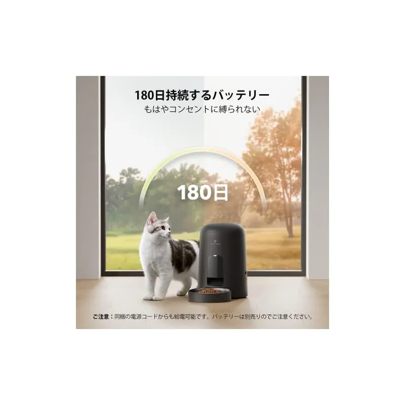 【無制限の置き場所】PETLIBRO AIR 自動給餌器はバッテリー駆動に対応しており(電池は付属していない)、D型乾電池を3本装着すれば、最大180日間使用できる。電源コンセントの制限を受けなくなったので、猫の好きな場所に自由に給餌器を置くことができる。配線を整理する手間が省け、家がすっきりする。さらに、ペットが電源コードをかじる心配もないので、より安全・安心。*同梱の電源コードからも給電可能、お好きな給電方式を自由に選択。 ??