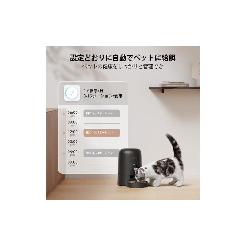 【ペットの健康管理】PETLIBRO AIR 猫用 自動給餌器は伝統的な手動給餌の代わりに自動給餌を行る。1日1~6回、毎回1~16ポーションの給餌スケジュールを設定できるので、ペットの体調に合わせて食事プランをカスタマイズするできる。 出張や残業、留守の時でも、定時にペットにフードを与えてくれる人がいないことを心配する必要はありません。この餌やり器は毎日決まった時間に適切な餌を与えることで、ペットがよりバランスのとれた健康的な食事を摂れるとともに、お客様に忙しい日常生活にゆとりを与えてくれる。 ??