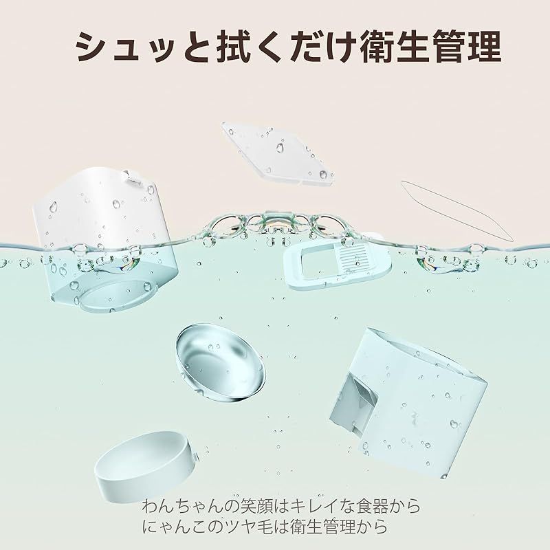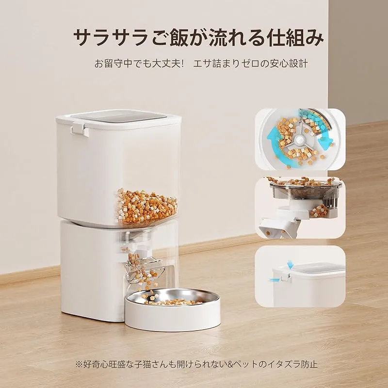 【商品概要】 「離れていてもピンポイント給餌可能」専用アプリから簡単操作!家中の別室でペットの食事タイミングを自由に設定可能。離れていても安心のリモート管理機能。部屋を移動中や仕事中のすき間時間にも簡単設定。最大10メートル範囲内で食事スケジュールを柔軟に管理。 「週末外出もストレスフリー」 5L大容量&ステンレス皿でドライフード5L(約3kg)搭載で多頭飼いにも安心。酸化防止の完全密閉構造が湿気やニオイ漏れをブロック。 「食ムラ防止&ダイエット支援」1食あたり6g~8gの超精密制御機能を搭載。排出量を±1g内に安定化!肥満気味ペットの食事管理や子猫の離乳食少量給餌に最適。 「緊急ダイレクトモード」ACアダプターと乾電池(単3×4本)のデュアル電源。災害時のバックアップ機能付きで「万が一」にも強い信頼性。 「完全静音設計&ノズル詰まり防止」36dB以下の超低騒音モーターで夜間給餌もストレスフリー。渦巻状特殊構造がフードの滞留を徹底排除。