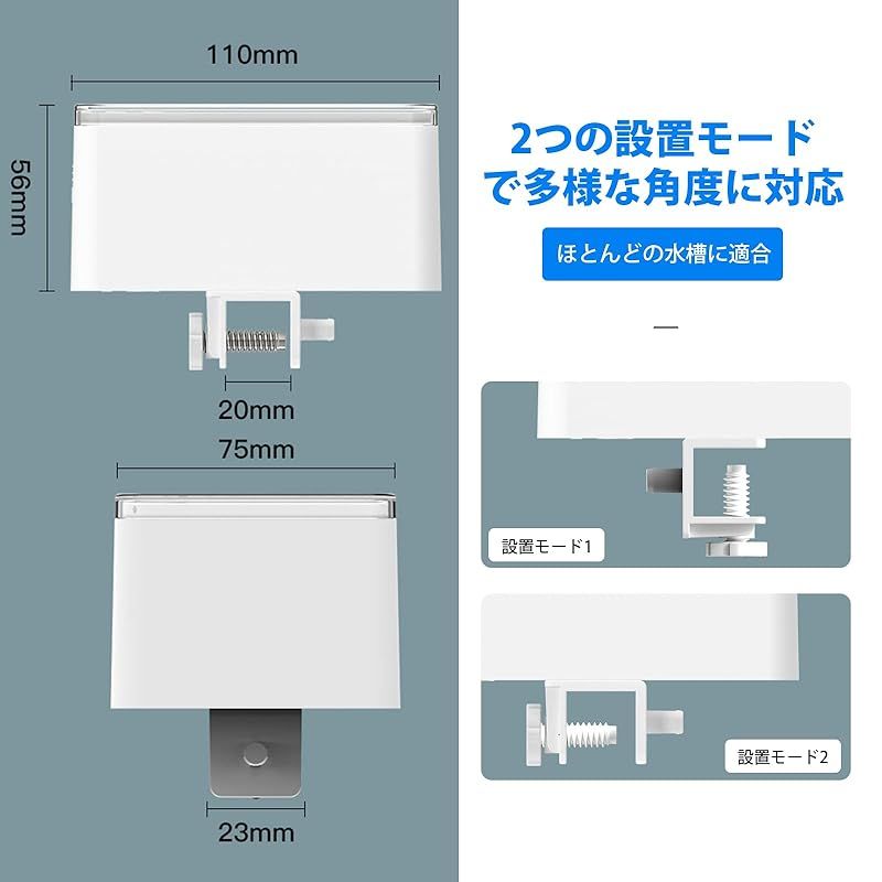 【2つの設置方法】水槽自動給餌器は異なるタイプの水槽に適した2つの異なる設置方法を提供します。縦型水槽の縁にクリップで簡単に固定でき、スイングバック固定タイプの向きを変えて水槽平面に固定することもできます。 様々なタイプの水槽に、ニーズに合わせてお選びいただけます。