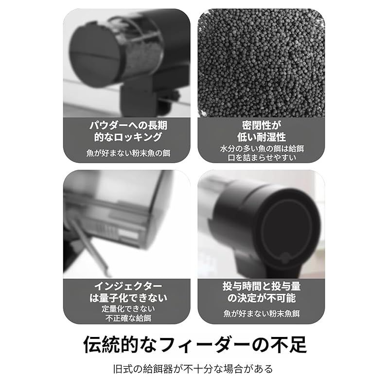 【使用簡単&静音】魚自動給餌器の上部には給餌口が設置されており、給餌箱を取り外す手間がなく、素早く簡単に餌を追加できます、給餌の音はほとんど聞こえません。メカニカルボタン+ LEDインジケーター、シンプルな操作と便利な設定、付着防止設計、付着した食品の自動検出。3つのAAAバッテリを3か月間使用でき、バッテリ低下LEDインジケータアラーム ※注:水面の上は湿気があり、サケースの餌を乾いた状態に保つために、フィーダーが水位を超えていることを確認してください。常に、 餌ドームを清潔する必要がある。