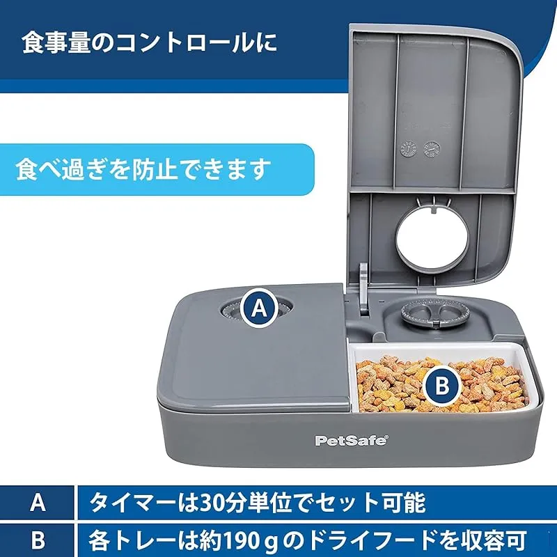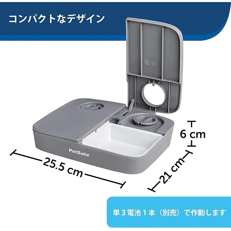 【商品概要】 操作がカンタンなダイヤル式のペット用自動給餌器。ダイヤルを回してタイマーをセットすると指定した時間にフタが開きます。ご使用には単3アルカリ電池1本が必要です。 ご飯は2食分セット可能。左右のトレイそれぞれにフタが開く設定ができます。タイマーは30分単位、1?24時間後まで指定可能。 トレーには約190gのドライフードが入ります。取り外し可能で、水洗い、食洗機使用OKです。ウェットフードは保冷剤を入れるスペースがないのでおすすめしません。 犬や猫が自力でフタを開けにくいよう従来のおるすばんフィーダーからデザインを改良しました。お部屋にあってもインテリアの邪魔にならないシンプルなデザインです。 サイズ:幅25×高さ5.5×奥行き20.5cm、重さ約440g /