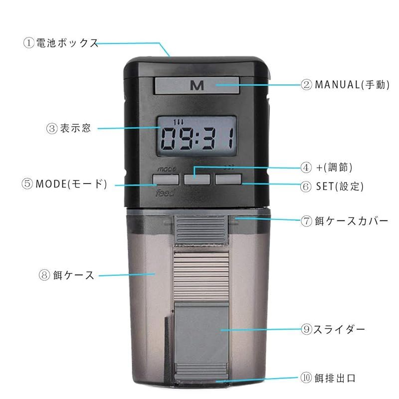 【給餌時間と給餌量を設定自由】:給餌量は一日四回給餌できます。餌やりの時間も自由に設定できます。給餌量コントロール自由で、給餌量調節スライドで給餌量調節可能です。すべての設定が自由に変更できます。 2×「AA」1.5Vアルカリ乾電池を使用してください 充電式電池またはカーボン電池を使用しないでください