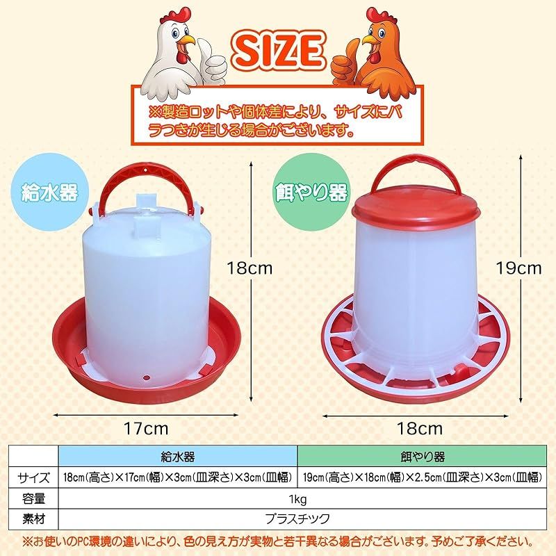 【商品概要】 うずら、ひよこ、にわとりに自動で餌やり・水やりができる、給餌器と給水器です。別名、ひよこフィーダー・チキンフィーダーとも。 エサ入れの受け皿には仕切りがあり、複数の鳥が食べるのに便利な形状を採用。エサが均等になり無駄のないエサやりが可能です。 餌入れ、水入れともにフィーダーのバケツ部分と受け皿は取り外し可能で掃除が簡単。常に清潔な状態で使用できます。保管時は重ねることができ、省スペース。 餌やり機は、上部の蓋を取り外し、餌を投入します。給水機は、容器は逆さにひっくり返して水を入れます。エサ、水はフィーダー部から受け皿に自動供給され、溢れることはありません。 鶉、雛、鶏はもちろん、カモやアヒルなど様々な鳥類のエサやり、水やりに使用可能。ウサギなどの小動物にもOK ※成鳥の大きさによっては餌口が小さく、餌の摂取が制限される可能性がありますので、ご了承ください。※本製品には製造工程上、バリが残っています。ご使用前に製品全体を確認し、バリを取り除いてください。